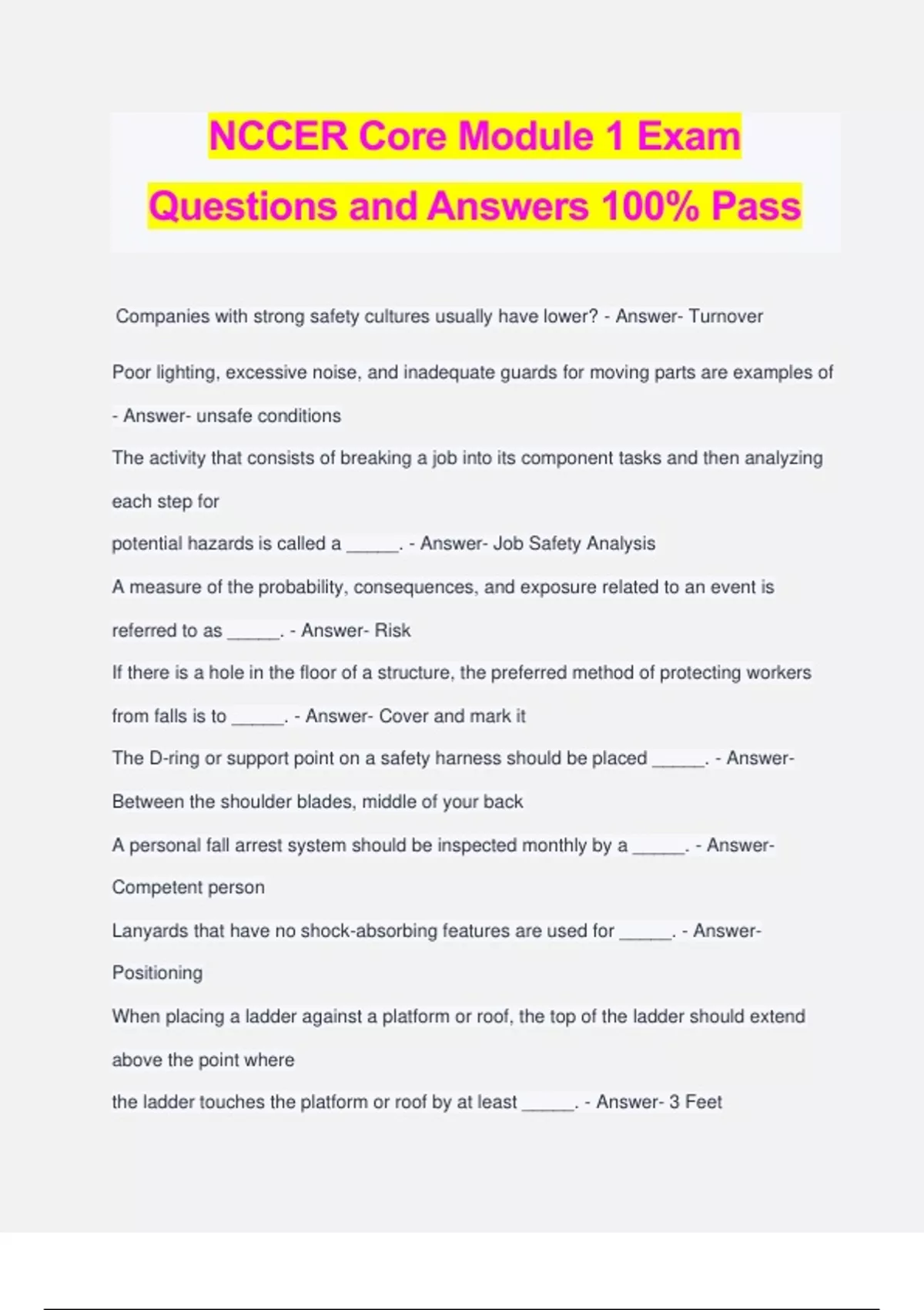 NCCER Core Module 1 Exam Questions and Answers 100% Pass Companies with strong safety cultures usually have lower? - Answer- Turnover Poor lighting, excessive noise, and inadequate guards for moving parts are examples of - Answer- unsafe conditions The activity that consists of breaking a job into its component tasks and then analyzing each step for potential hazards is called a _____. - Answer- Job Safety Analysis A measure of the probability, consequences, and exposure related to an event is referred to as _____. - Answer- Risk If there is a hole in the floor of a structure, the preferred method of protecting workers from falls is to _____. - Answer- Cover and mark it The D-ring or support point on a safety harness should be placed _____. - Answer- Between the shoulder blades, middle of your back A personal fall arrest system should be inspected monthly by a _____. - Answer- Competent person Lanyards that have no shock-absorbing features are used for _____. - Answer- Positioning When placing a ladder against a platform or roof, the top of the ladder should extend above the point where the ladder touches the platform or roof by at least _____. - Answer- 3 Feet