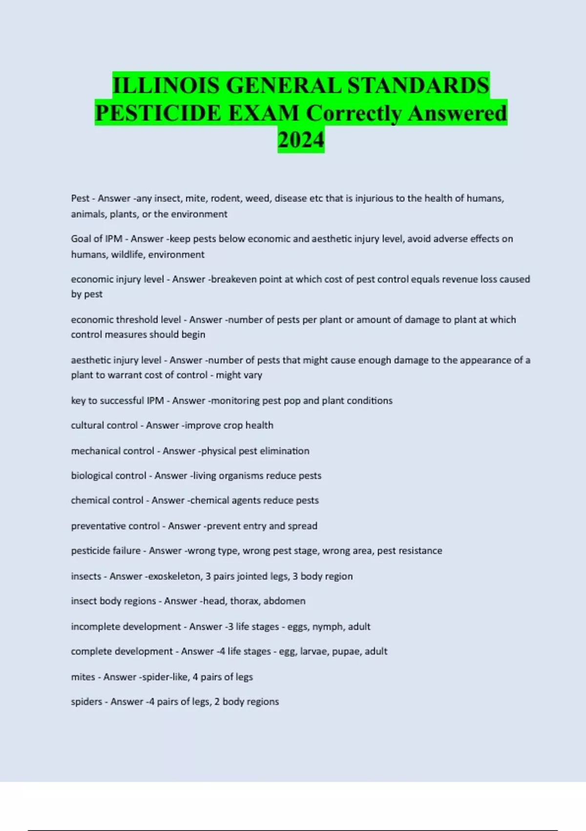 ILLINOIS GENERAL STANDARDS PESTICIDE EXAM Correctly Answered 2024 Pest - Answer -any insect, mite, rodent, weed, disease etc that is injurious to the health of humans, animals, plants, or the environment Goal of IPM - Answer -keep pests below economic and aesthetic injury level, avoid adverse effects on humans, wildlife, environment economic injury level - Answer -breakeven point at which cost of pest control equals revenue loss caused by pest economic threshold level - Answer -number of pests per plant or amount of damage to plant at which control measures should begin aesthetic injury level - Answer -number of pests that might cause enough damage to the appearance of a plant to warrant cost of control - might vary key to successful IPM - Answer -monitoring pest pop and plant conditions cultural control - Answer -improve crop health mechanical control - Answer -physical pest elimination biological control - Answer -living organisms reduce pests chemical control - Answer -chemical agents reduce pests preventative control - Answer -prevent entry and spread pesticide failure - Answer -wrong type, wrong pest stage, wrong area, pest resistance insects - Answer -exoskeleton, 3 pairs jointed legs, 3 body region insect body regions - Answer -head, thorax, abdomen incomplete development - Answer -3 life stages - eggs, nymph, adult complete development - Answer -4 life stages - egg, larvae, pupae, adult mites - Answer -spider-like, 4 pairs of legs spiders - Answer -4 pairs of legs, 2 body regionscrustaceans - Answer -7 pairs of legs ex) pillbugs birds - Answer -all protected except non-native ex) starlings, house sparrows mammals - Answer -protected except rats, mice, ground squirrels noninfectious disease - Answer -cannot be transferred pest to pest or plant to plant, often result of unfavorable conditions infectious disease - Answer -multiply within host, transferable chlorosis - Answer -yellowing of leaves Mosiac - Answer -green and yellow patching gall - Answer -abnormal swelli