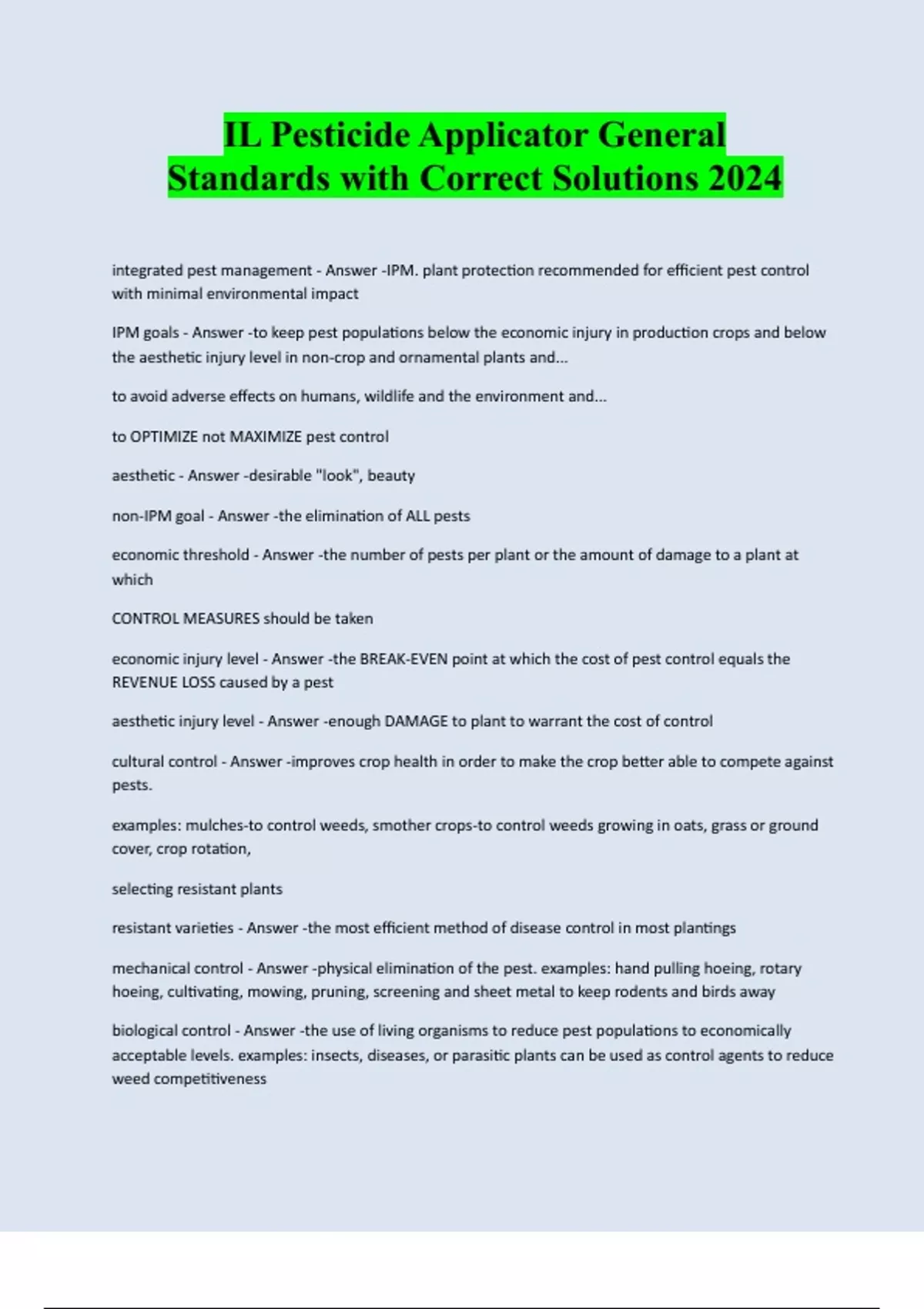 IL Pesticide Applicator General Standards with Correct Solutions 2024 integrated pest management - Answer -IPM. plant protection recommended for efficient pest control with minimal environmental impact IPM goals - Answer -to keep pest populations below the economic injury in production crops and below the aesthetic injury level in non-crop and ornamental plants and... to avoid adverse effects on humans, wildlife and the environment and... to OPTIMIZE not MAXIMIZE pest control aesthetic - Answer -desirable "look", beauty non-IPM goal - Answer -the elimination of ALL pests economic threshold - Answer -the number of pests per plant or the amount of damage to a plant at which CONTROL MEASURES should be taken economic injury level - Answer -the BREAK-EVEN point at which the cost of pest control equals the REVENUE LOSS caused by a pest aesthetic injury level - Answer -enough DAMAGE to plant to warrant the cost of control cultural control - Answer -improves crop health in order to make the crop better able to compete against pests. examples: mulches-to control weeds, smother crops-to control weeds growing in oats, grass or ground cover, crop rotation, selecting resistant plants resistant varieties - Answer -the most efficient method of disease control in most plantings mechanical control - Answer -physical elimination of the pest. examples: hand pulling hoeing, rotary hoeing, cultivating, mowing, pruning, screening and sheet metal to keep rodents and birds away biological control - Answer -the use of living organisms to reduce pest populations to economically acceptable levels. examples: insects, diseases, or parasitic plants can be used as control agents to reduce weed competitivenesspreventive control - Answer -helps prevent the spread and entry of pests. examples: quarantines, inspections, regulations enforced chemical control - Answer -an integral part of an IPM program. Pesticides offer an economical and dependable method of pest control. pesticide failure - Answer -. applying the wrong type of pesticide . applying the pesticide at the wrong time . failure to apply pesticide at the right location of the infested part of the plant . applying a pesticide to a resistant pest insect identification - Answer -adults have 3 pairs of jointed