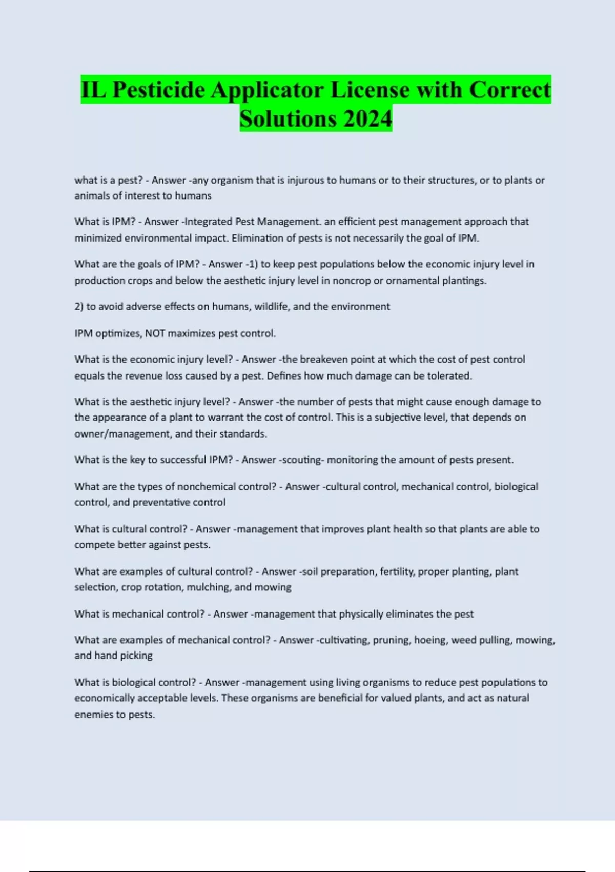 IL Pesticide Applicator License with Correct Solutions 2024 what is a pest? - Answer -any organism that is injurous to humans or to their structures, or to plants or animals of interest to humans What is IPM? - Answer -Integrated Pest Management. an efficient pest management approach that minimized environmental impact. Elimination of pests is not necessarily the goal of IPM. What are the goals of IPM? - Answer -1) to keep pest populations below the economic injury level in production crops and below the aesthetic injury level in noncrop or ornamental plantings. 2) to avoid adverse effects on humans, wildlife, and the environment IPM optimizes, NOT maximizes pest control. What is the economic injury level? - Answer -the breakeven point at which the cost of pest control equals the revenue loss caused by a pest. Defines how much damage can be tolerated. What is the aesthetic injury level? - Answer -the number of pests that might cause enough damage to the appearance of a plant to warrant the cost of control. This is a subjective level, that depends on owner/management, and their standards. What is the key to successful IPM? - Answer -scouting- monitoring the amount of pests present. What are the types of nonchemical control? - Answer -cultural control, mechanical control, biological control, and preventative control What is cultural control? - Answer -management that improves plant health so that plants are able to compete better against pests. What are examples of cultural control? - Answer -soil preparation, fertility, proper planting, plant selection, crop rotation, mulching, and mowing What is mechanical control? - Answer -management that physically eliminates the pest What are examples of mechanical control? - Answer -cultivating, pruning, hoeing, weed pulling, mowing, and hand picking What is biological control? - Answer -management using living organisms to reduce pest populations to economically acceptable levels. These organisms are beneficial for valued plants, and act as natural enemies to pests.What are examples of biological control? - Answer -predators, parasites, pest diseases examples***: parasitic wasps on weevils, mealybugs, and scales. Bacillus species (some bacteria) for caterpillars and mosquitoes. Carp for aquatic weeds. weevils for musk thistle What is preventative control? - Answer -management that helps prevent the entry and spread of pests. This can include using weed-free seed and transplants, cleaning equipment used for tillage, mowing, pruning, harvesting, and transport, and controlling patches of weeds before they produce seeds. What are examples of preventative control? - Answer -quarantines, inspections, and certified seed What should be considered before using chemical control? - Answer -are there other, nonchemical control methods that are effective? Has scouting indicated that the pest population is large enough to warrant control? (economic and aesthetic injury levels) Is this the correct time to apply pesticides for optimal control? What are common reasons that a pesticide may fail to control a pest? - A