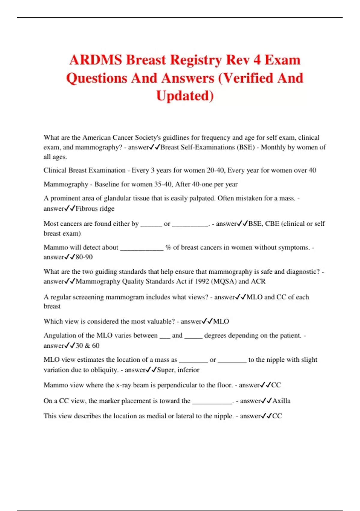 ARDMS Breast Registry Rev 4 Exam Questions And Answers (Verified And Updated) What are the American Cancer Society's guidlines for frequency and age for self exam, clinical exam, and mammography? - answerBreast Self-Examinations (BSE) - Monthly by women of all ages. Clinical Breast Examination - Every 3 years for women 20-40, Every year for women over 40 Mammography - Baseline for women 35-40, After 40-one per year A prominent area of glandular tissue that is easily palpated. Often mistaken for a mass. - answerFibrous ridge Most cancers are found either by ______ or __________. - answerBSE, CBE (clinical or self breast exam) Mammo will detect about ____________ % of breast cancers in women without symptoms. - answer80-90 What are the two guiding standards that help ensure that mammography is safe and diagnostic? - answerMammography Quality Standards Act if 1992 (MQSA) and ACR A regular screeening mammogram includes what views? - answerMLO and CC of each breast Which view is considered the most valuable? - answerMLO Angulation of the MLO varies between