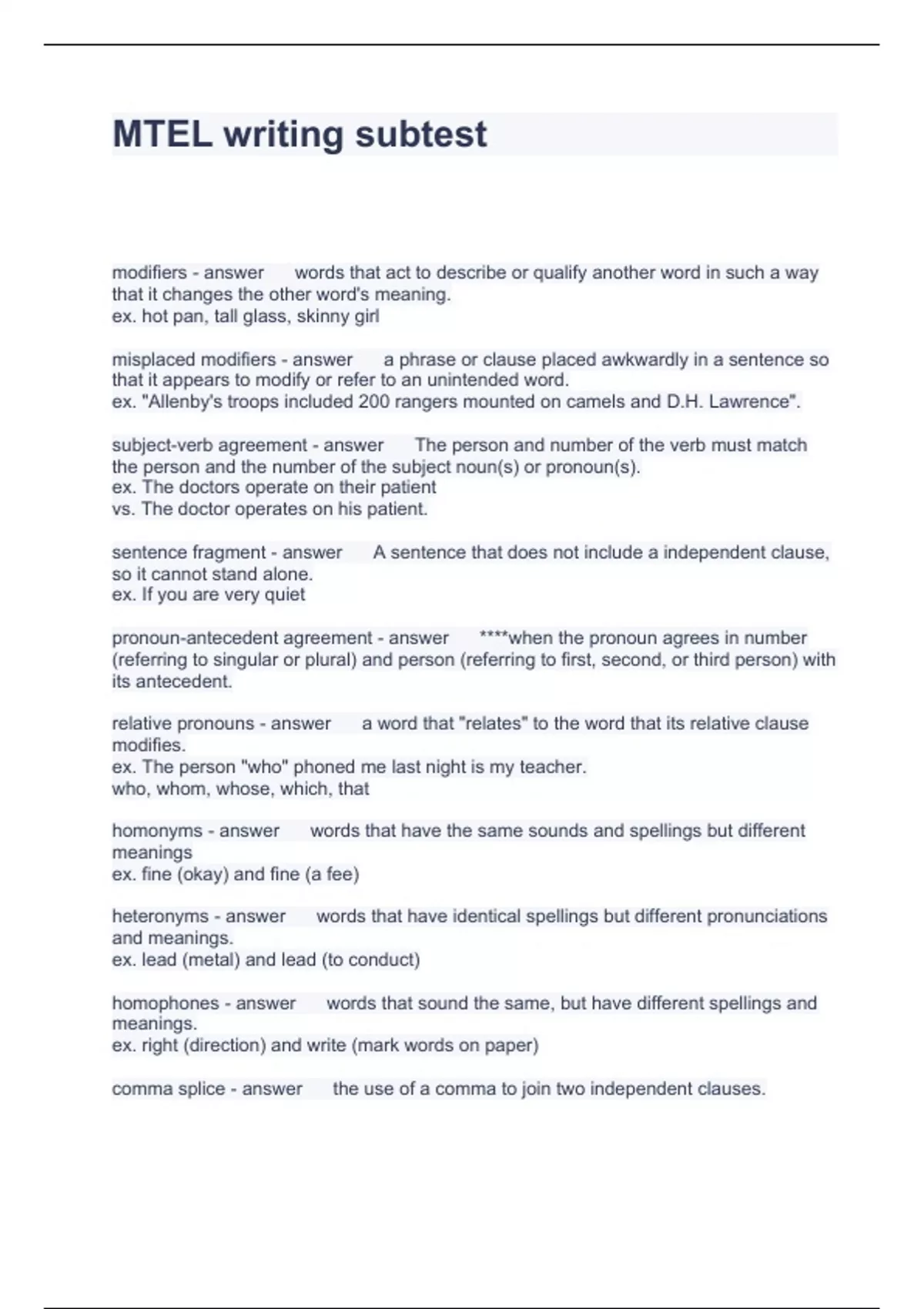 MTEL writing subtest Questions and Answers Latest Updated