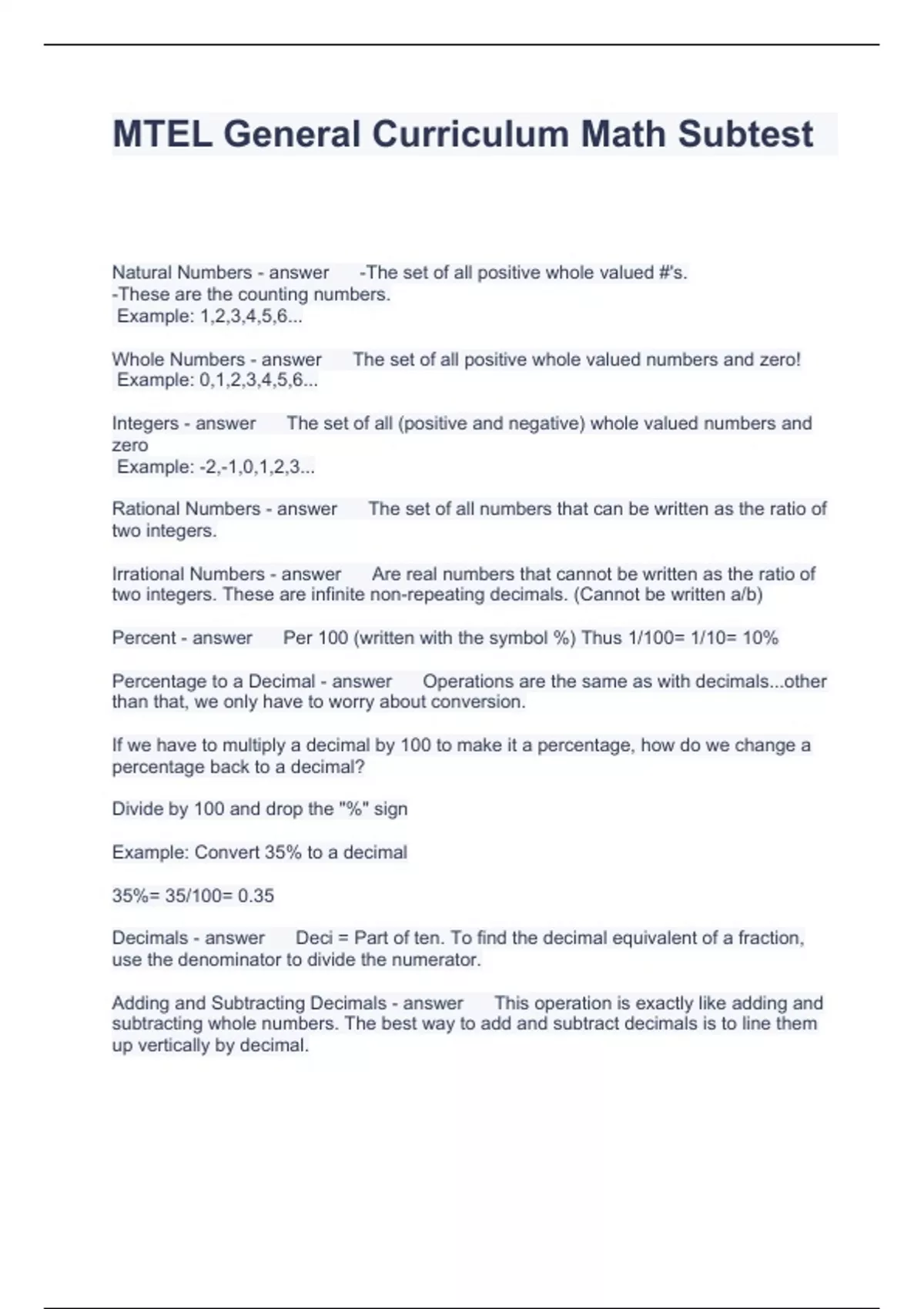 MTEL General Curriculum Math Subtest Questions and Answers Fully solved