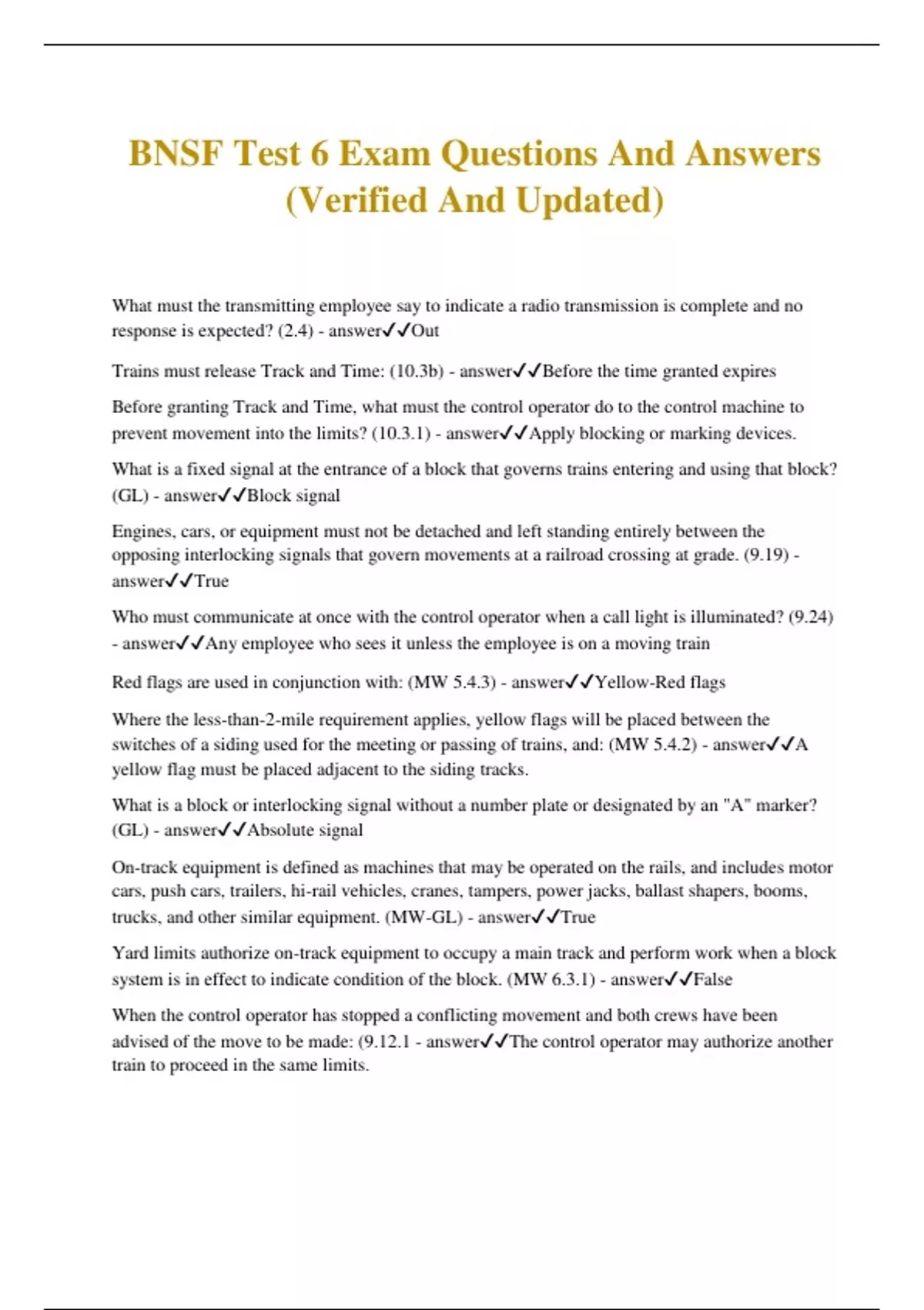 BNSF Test 6 Exam Questions And Answers (Verified And Updated) What must the transmitting employee say to indicate a radio transmission is complete and no response is expected? (2.4) - answerOut Trains must release Track and Time: (10.3b) - answerBefore the time granted expires Before granting Track and Time, what must the control operator do to the control machine to prevent movement into the limits? (10.3.1) - answerApply blocking or marking devices. What is a fixed signal at the entrance of a block that governs trains entering and using that block? (GL) - answerBlock signal Engines, cars, or equipment must not be detached and left standing entirely between the opposing interlocking signals that govern movements at a railroad crossing at grade. (9.19) - answerTrue Who must communicate at once with the control operator when a call light is illuminated? (9.24) - answerAny employee who sees it unless the employee is on a moving train Red flags are used in conjunction with: (MW 5.4.3) - answerYellow-Red flags Where the less-than-2-mile requirement applies, yellow flags will be placed between the switches of a siding used for the meeting or passing of trains, and: (MW 5.4.2) - answerA yellow flag must be placed adjacent to the siding tracks. What is a block or interlocking signal without a number plate or designated by an "A" marker? (GL) - answerAbsolute signal On-track equipment is defined as machines that may be operated on the rails, and includes motor cars, push cars, trailers, hi-rail vehicles, cranes, tampers, power jacks, ballast shapers, booms, trucks, and other similar equipment. (MW-GL) - answerTrue Yard limits authorize on-track equipment to occupy a main track and perform work when a block system is in effect to indicate condition of the block. (MW 6.3.1) - answerFalse When the control operator has stopped a conflicting movement and both crews have been advised of the move to be made: (9.12.1 - answerThe control operator may authorize another train to proceed in the same limits. What is a series of consecutive blocks governed by block signals, cab signals, or both and the signals are activated by a train or by certain conditions that affect the block use? (GL) - answerAutomatic Block Signal System Within CTC, a train is stopped at a Stop signal, no conflicting movement is evident, and the train is not within Track and Time limits. What action should the crew take? (9.12.1) - answerImmediately contact the control operator. Except when communication has failed, an emergency release must not be operated or its seal broken: (9.18) - answerWithout permission from the control operator or train dispatcher If a signal or signal appliance functions improperly or the track is damaged: (9.5.2) - answerNo movements on such routes may be permitted until the track and signal appliance are examined and movement can occur safely. Signals that govern movement on affected routes must display a Stop indication. What is a block signal system that uses block signal indications to authorize train movement? (GL) - answerCentralized Traffic Control A red flag may be displayed between the rails: (MW 5.4.7) - answerOn any track Block signals, cab signals, or both: (9.3) - answerGovern the use of blocks When signals are suspended, until informed that switches are lined for the main track and locked in the hand position, movements over dual control switches must: (9.23.1) - answerNot be made until train has stopped, switch is inspected, circuit is fouled, and assured switches are properly lined Track and Time may be granted for: (10.3.2) - answerTrains, Machines, track cars, or employees A train initiating movement between signals where there is no governing signal: (9.10) - answerMust move at restricted speed until the leading wheels have passed the next governing signal What is a signal indication? (GL) - answerThe action required by the signal aspect When a train is approaching a Stop indication in CTC, the control operator knows there is no conflicting movement, and the train is not within Track and Time limits, instructions to proceed will be issued as follows: (9.12.1) - answer"After stopping, (train) at (location) has authority to pass signal displaying Stop indication." Machines, track cars, or employees must be clear of the limits before the employee granted Track and Time releases the authority. (10.3.2) - answerTrue Joint Track and Time may never be granted. (10.3.3) - answerFalse