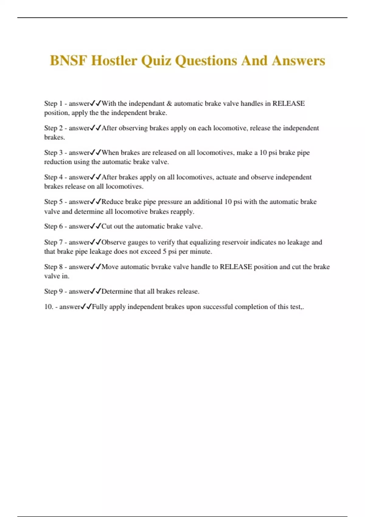 BNSF Hostler Quiz Questions And Answers Step 1 - answerWith the independant & automatic brake valve handles in RELEASE position, apply the the independent brake. Step 2 - answerAfter observing brakes apply on each locomotive, release the independent brakes. Step 3 - answerWhen brakes are released on all locomotives, make a 10 psi brake pipe reduction using the automatic brake valve. Step 4 - answerAfter brakes apply on all locomotives, actuate and observe independent brakes release on all locomotives.