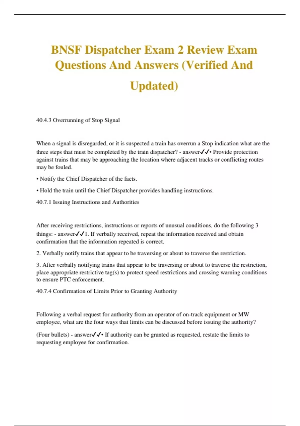 BNSF Dispatcher Exam 2 Review Exam Questions And Answers (Verified And Updated) 40.4.3 Overrunning of Stop Signal When a signal is disregarded, or it is suspected a train has overrun a Stop indication what are the three steps that must be completed by the train dispatcher? - answer• Provide protection against trains that may be approaching the location where adjacent tracks or conflicting routes may be fouled. • Notify the Chief Dispatcher of the facts. • Hold the train until the Chief Dispatcher provides handling instructions. 40.7.1 Issuing Instructions and Authorities After receiving restrictions, instructions or reports of unusual conditions, do the following 3 things: - answer1. If verbally received, repeat the information received and obtain confirmation that the information repeated is correct. 2. Verbally notify trains that appear to be traversing or about to traverse the restriction. 3. After verbally notifying trains that appear to be traversing or about to traverse the restriction, place appropriate restrictive tag(s) to protect speed restrictions and crossing warning conditions to ensure PTC enforcement. 40.7.4 Confirmation of Limits Prior to Granting Authority Following a verbal request for authority from an operator of on-track equipment or MW employee, what are the four ways that limits can be discussed before issuing the authority? (Four bullets) - answer• If authority can be granted as requested, restate the limits to requesting employee for confirmation. • If confirmation is received from the employee, issue the authority with no change in the confirmed limits. • If unable to grant authority with limits as requested, state limits that can be given, asking employee if usable. • If changed limits are usable, require the employee to repeat the changed limits to confirm understanding before issuing. 40.8 Back Up Movements What are the 5 things that must be completed before granting a backup move? (Memory jogger) - answerA - Is there an additional authority in effect that must be protected? B - Are there any Form Bs in effect that are or will be in the limits? C - Are there any Form Cs in effect removing the track from service? D - Check that permission has not been granted to leave a switch in the reverse position E - "Do you need extra/additional authority behind your train to accomplish this back up move?" 40.21 Rule Violations If it is suspected or becomes apparent that you, another train dispatcher or employees in the field may be involved in a rules violation, what action must be taken? - answerImmediately report the situation to the Chief Dispatcher. 40.24 Hi-Rail Limits Compliance System (HLCS) When an HLCS alert is received about an employee outside of limits, what are the steps for this alert? - answerPromptly check for any conflicting movements and provide protection against conflicting movements. Do not request any signal or switch changes. ESPN memory jogger Employee outside of limits? Contact the employee or vehicle number that was reported in the warning, advising them where the system indicates they are located and ask them to verify their location