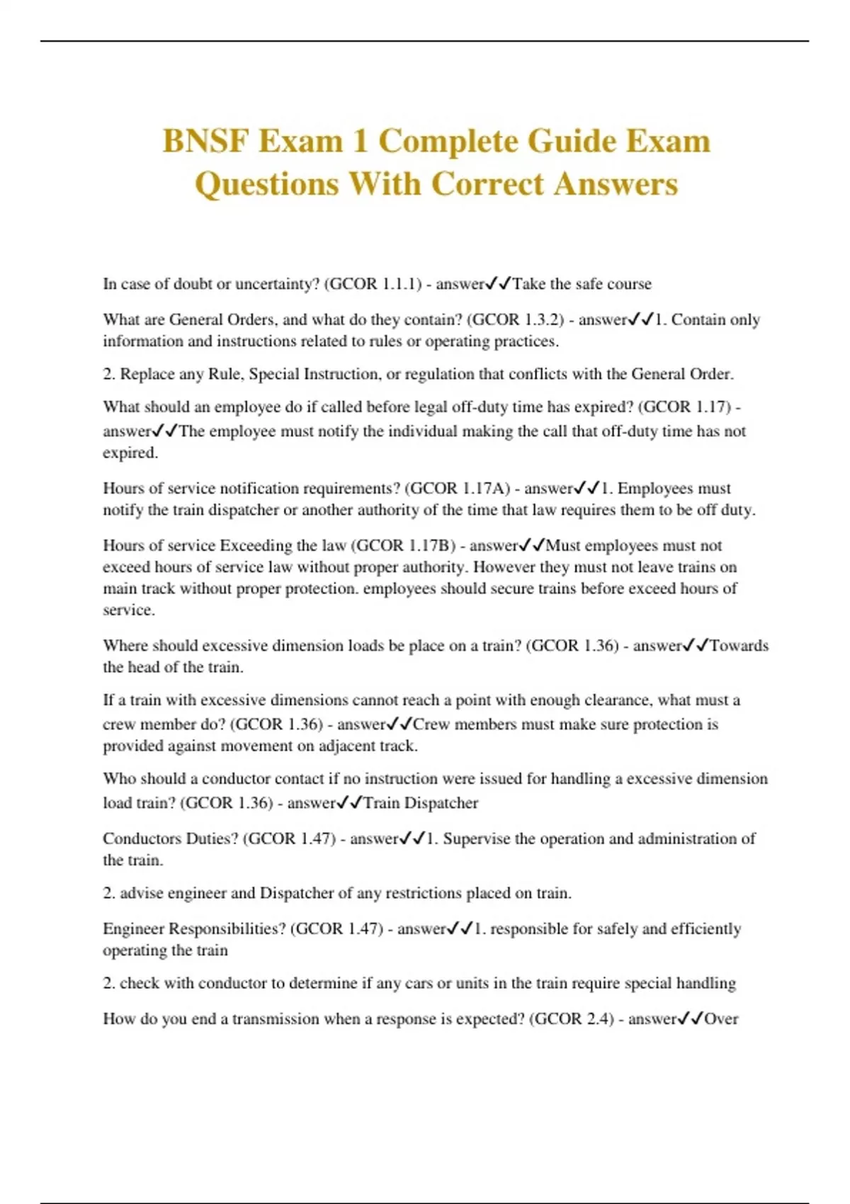 BNSF Exam 1 Complete Guide Exam Questions With Correct Answers In case of doubt or uncertainty? (GCOR 1.1.1) - answerTake the safe course What are General Orders, and what do they contain? (GCOR 1.3.2) - answer1. Contain only information and instructions related to rules or operating practices. 2. Replace any Rule, Special Instruction, or regulation that conflicts with the General Order. What should an employee do if called before legal off-duty time has expired? (GCOR 1.17) - answerThe employee must notify the individual making the call that off-duty time has not expired. Hours of service notification requirements? (GCOR 1.17A) - answer1. Employees must notify the train dispatcher or another authority of the time that law requires them to be off duty. Hours of service Exceeding the law (GCOR 1.17B) - answerMust employees must not exceed hours of service law without proper authority. However they must not leave trains on main track without proper protection. employees should secure trains before exceed hours of service. Where should excessive dimension loads be place on a train? (GCOR 1.36) - answerTowards the head of the train. If a train with excessive dimensions cannot reach a point with enough clearance, what must a crew member do? (GCOR 1.36) - answerCrew members must make sure protection is provided against movement on adjacent track. Who should a conductor contact if no instruction were issued for handling a excessive dimension load train? (GCOR 1.36) - answerTrain Dispatcher Conductors Duties? (GCOR 1.47) - answer1. Supervise the operation and administration of the train. 2. advise engineer and Dispatcher of any restrictions placed on train. Engineer Responsibilities? (GCOR 1.47) - answer1. responsible for safely and efficiently operating the train 2. check with conductor to determine if any cars or units in the train require special handling How do you end a transmission when a response is expected? (GCOR 2.4) - answerOver How do you end a transmission when a response is NOT expected? (GCOR 2.4) - answerOut Mandatory directives must conform to applicable operating rules and the following: - answer1. Train dispatcher must state which mandatory directive will be transmitted. 2. employee will state Name, occupation, Location 3. employee receiving mandatory directive must copy it in writing using the format outlined in the operating rules. 4. conductor and engineer must each have a written copy. each crew member must read and understand it. When transmitting and repeating mandatory directives: (GCOR 2.14.1) - answer1. State and spell single digit numbers by number and digit 2. State multiple digit numbers by number and digit 3. Identify decimals points as "points", "dot", or "decimal". 4. state and spell directions What must occur before a field employee reports clear or releases a portion of authority limits and train dispatcher accepts the information? (GCOR 2.14.2) - answer1. Employee will state identification and authority number. 2. train dispatcher will have required form or computer screen displayed for entry and confirmation. 3. Train dispatcher and employee will carefully match the verbally transmitted information to ensure it is correct At least 24 hours prior to a new timetable goes into effect, notification will be made by what? - answerGeneral Order What goes into effect 24 hours prior to the new timetable and stay in effect for 6 days? - answerTrack Bulletin What will special instruction replace? - answerSpecial instructions replace any rule or regulation with which they conflict. Timetable Character A - answerAutomatic Interlocking Timetable Character B - answerGeneral orders, Notices, and circulars Timetable Character C - answerRadio Communication Timetable Character g - answerGate, Normal position against conflicting route Timetable Character G - answerGate, normal position against this subdivision Timetable Character J - answerJunction Timetable Character M - answerManual interlocking Timetable Character P - answerTelephone Timetable Character R - answerRestricted Limits Timetable Character S - answerRailroad crossing Protected by Permanent stop sign Timetable Character T - answerTurning Facility Timetable Character U - answerRailroad crossing not protected by signals or gates Timetable Character X - answercrossover Timetable Character X(2) - answermultiple crossovers Timetable Character Y - answerYard limits What do Yellow flags indicate? - answerTemporary speed restriction, warn trains to restrict movement because of track conditions or structures. What do Yellow-red flags indicate? - answerwhere a train may be required to stop. how flags are flags supposed to be place from restriction? - answer2 miles If a flag is not 2 miles (Short flagged) what is it noted? - answerTrack bulletin, Track warrant, or general order What does a train crew have to do if a yellow flag is displayed and no restriction is in effect? (GCOR 5.4.2) - answeronce two miles beyond the yellow flag: 1. continue to move not exceeding 10 MPH 2. Resume speed only after; the crew received a mandatory directive associated with the yellow flag,, the rear of the train has passed a green flag, or the rear of the train is 4 miles beyond the yellow flag and the train dispatcher has verified no mandatory directive is associated with the restriction. What does a red flag mean? (GCOR 5.4.7) - answerWhere trains must stop When can a train proceed past a red flag? (GCOR 5.4.2) - answerWhen the EIC give instructions Can the train procced without stopping past a red flag? (5.4.2) - answerYes, only if the EIC Gives permission What does a train crew has to do when approaching a red flag? (5.4.7) - answerContact the EIC