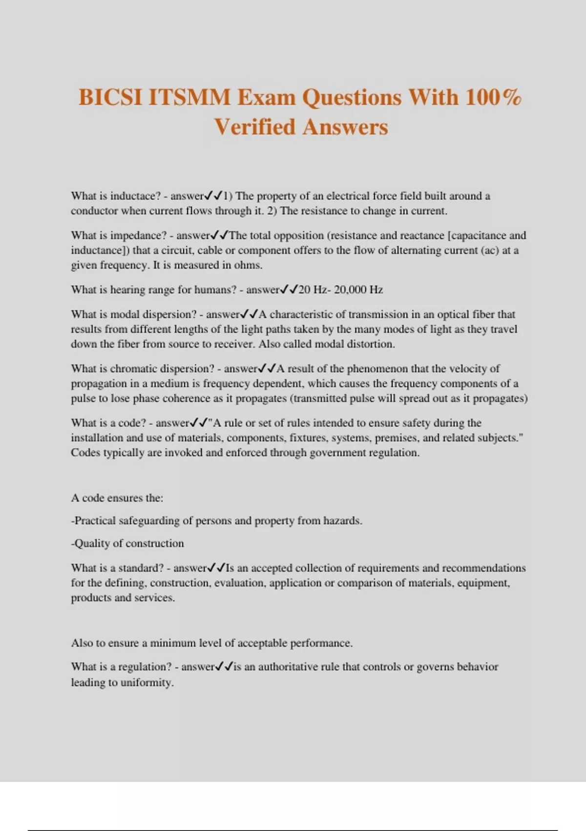 BICSI ITSMM Exam Questions With 100% Verified Answers What is inductace? - answer1) The property of an electrical force field built around a conductor when current flows through it. 2) The resistance to change in current. What is impedance? - answerThe total opposition (resistance and reactance [capacitance and inductance]) that a circuit, cable or component offers to the flow of alternating current (ac) at a given frequency. It is measured in ohms. What is hearing range for humans? - answer20 Hz- 20,000 Hz What is modal dispersion? - answerA characteristic of transmission in an optical fiber that results from different lengths of the light paths taken by the many modes of light as they travel down the fiber from source to receiver. Also called modal distortion. What is chromatic dispersion? - answerA result of the phenomenon that the velocity of propagation in a medium is frequency dependent, which causes the frequency components of a pulse to lose phase coherence as it propagates (transmitted pulse will spread out as it propagates) What is a code? - answer"A rule or set of rules intended to ensure safety during the installation and use of materials, components, fixtures, systems, premises, and related subjects." Codes typically are invoked and enforced through government regulation. A code ensures the: -Practical safeguarding of persons and property from hazards. -Quality of construction What is a standard? - answerIs an accepted collection of requirements and recommendations for the defining, construction, evaluation, application or comparison of materials, equipment, products and services. Also to ensure a minimum level of acceptable performance. What is a regulation? - answeris an authoritative rule that controls or governs behavior leading to uniformity. What is SCS? - answerStructured Cabling System What is MC (CD)? - answerBuilding or campus serving cross connect in the ER for connecting entrance cabling, backbone cabling, and equipment cabling. Main cross connect/ campus distributor What is IC (BD)? - answerBuilding-serving cross-connect points located between the MC (CD) and HC (FD) in interbuilding backbone cabling. Intermediate cross connect/ building distributor What is HC (FD)? - answerFloor-serving location for the cross connection of horizontal cabling to other cabling and equipment. Horizontal cross connect/ floor distributor A first level backbone consists of: - answercabling that is installed between an MC (CD) and an IC (BD) or a horizontal cross-connect (HC [floor distributor (FD)]). A second level backbone consists of: - answeris a cable that is installed between an IC (BD) and an HC (FD). The color....Orange - answerDemarcation Point The color....Green - answerNetwork Connections (network, auxiliary equipment) The color....Purple - answerCommon equipment (connections to PBX, mainframe computer, LAN, multiplexer) The color....White - answerFirst level backbone (termination of building backbone cable connecting MC [CD] to ICs [BDs]) The color....Gray - answerSecond level Backbone (termination of building backbone cable connecting ICs [BDs] to HCs [FDs]) The color....Blue - answerHorizontal cable ( horizontal connections to telecommunications outlet/connectors, formerly referred to as "station cable" The color....Brown - answerInterbuilding backbone (campus cable terminations) * Brown takes precedence over White or Gray for interbuilding runs