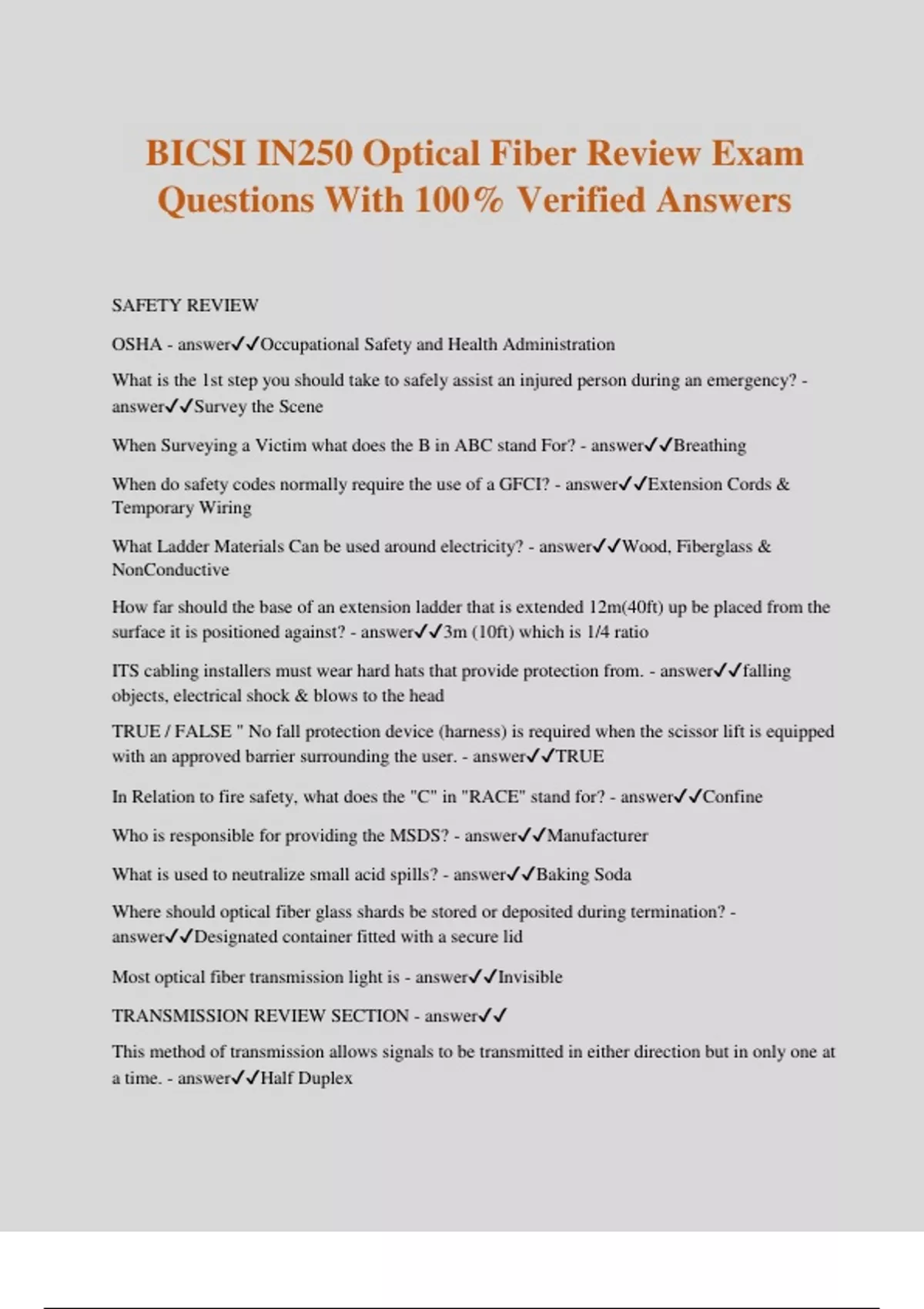 BICSI IN250 Optical Fiber Review Exam Questions With 100% Verified Answers SAFETY REVIEW OSHA - answerOccupational Safety and Health Administration What is the 1st step you should take to safely assist an injured person during an emergency? - answerSurvey the Scene When Surveying a Victim what does the B in ABC stand For? - answerBreathing When do safety codes normally require the use of a GFCI? - answerExtension Cords & Temporary Wiring What Ladder Materials Can be used around electricity? - answerWood, Fiberglass & NonConductive How far should the base of an extension ladder that is extended 12m(40ft) up be placed from the surface it is positioned against? - answer3m (10ft) which is 1/4 ratio ITS cabling installers must wear hard hats that provide protection from. - answerfalling objects, electrical shock & blows to the head TRUE / FALSE " No fall protection device (harness) is required when the scissor lift is equipped with an approved barrier surrounding the user. - answerTRUE In Relation to fire safety, what does the "C" in "RACE" stand for? - answerConfine Who is responsible for providing the MSDS? - answerManufacturer What is used to neutralize small acid spills? - answerBaking Soda Where should optical fiber glass shards be stored or deposited during termination? - answerDesignated container fitted with a secure lid Most optical fiber transmission light is - answerInvisible TRANSMISSION REVIEW SECTION - answer This method of transmission allows signals to be transmitted in either direction but in only one at a time. - answerHalf Duplex The number of cycles a signal is repeated in a given time frame is called - answerFrequency The basic unit of digital transmission is a - answerBit Which of the following terms quantifies the bandwidth of a cabling system and relates to the information-handling capability of a given media - answerMegahertz Most new fiber optic network installations use - answer50/125um multimode laser optimized cable Increasing either the length of an optical fiber cable or the wavelength of the light source will - answerdecrease the bandwidth The spreading out of light pulses in an optical fiber cable due to the multiple paths taken by many modes as they travel down the fiber is known as - answerModal Dispersion Multimode optical fiber attenuation is referenced in_________ and is affected by the_______________ - answerdB/km, Wavelength of the light source STRUCTURED CABLING SYSTEMS REVIEW QUESTIONS - answer A structured ITS cabling system is intended to serve a wide range of uses including access to - answerplain old telephone services , innovative telephone services & computer networking How many backbone levels are allowed in a structured cabling system? - answer2 What is the term that identifies where the service provider relinquishes circuit responsibility to the customer? - answerDemarcation Point Where do outside plant cables enter the building? - answerEntrance facility (EF) Over the lifecycle of a building, what is the most cost-effective permanent entrance? - answerUnderground What Service Entrance Has the lowest installation costs? - answerAerial What is BICSI recommendation for the minimum number of cables to a work area? - answer2 What is the Maximum length of an equipment cord in a work area (NOT USING a MUTOA)? - answer5m (16.5 ft) What is the maximum length for a horizontal optical fiber cable? - answer90 m (295 ft ) Centralized optical fiber cabling is designed as an alternative to - answerAn optical cross- connection located in the TR Which color termination field identifies "common equipment" - answerPurple