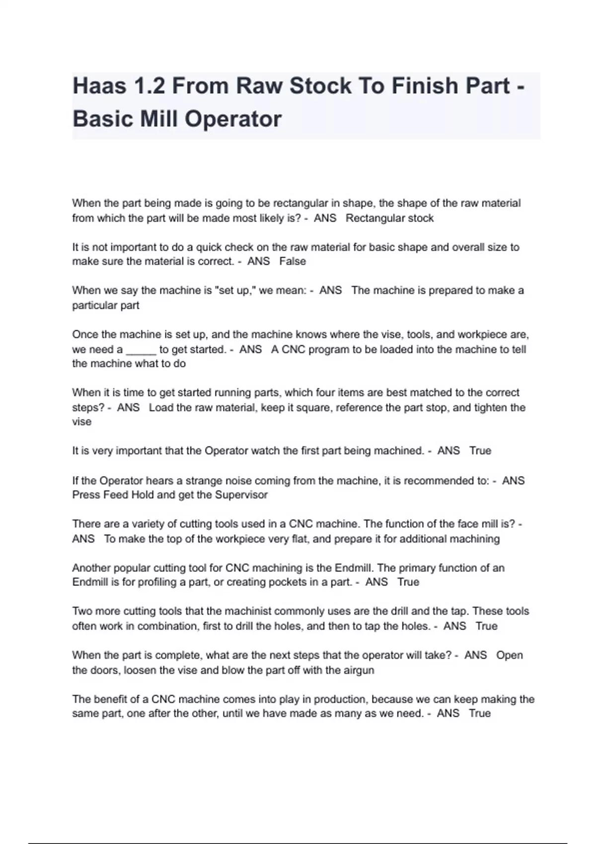 When the part being made is going to be rectangular in shape, the shape of the raw material from which the part will be made most likely is? - ANS Rectangular stock It is not important to do a quick check on the raw material for basic shape and overall size to make sure the material is correct. - ANS False When we say the machine is "set up," we mean: - ANS The machine is prepared to make a particular part