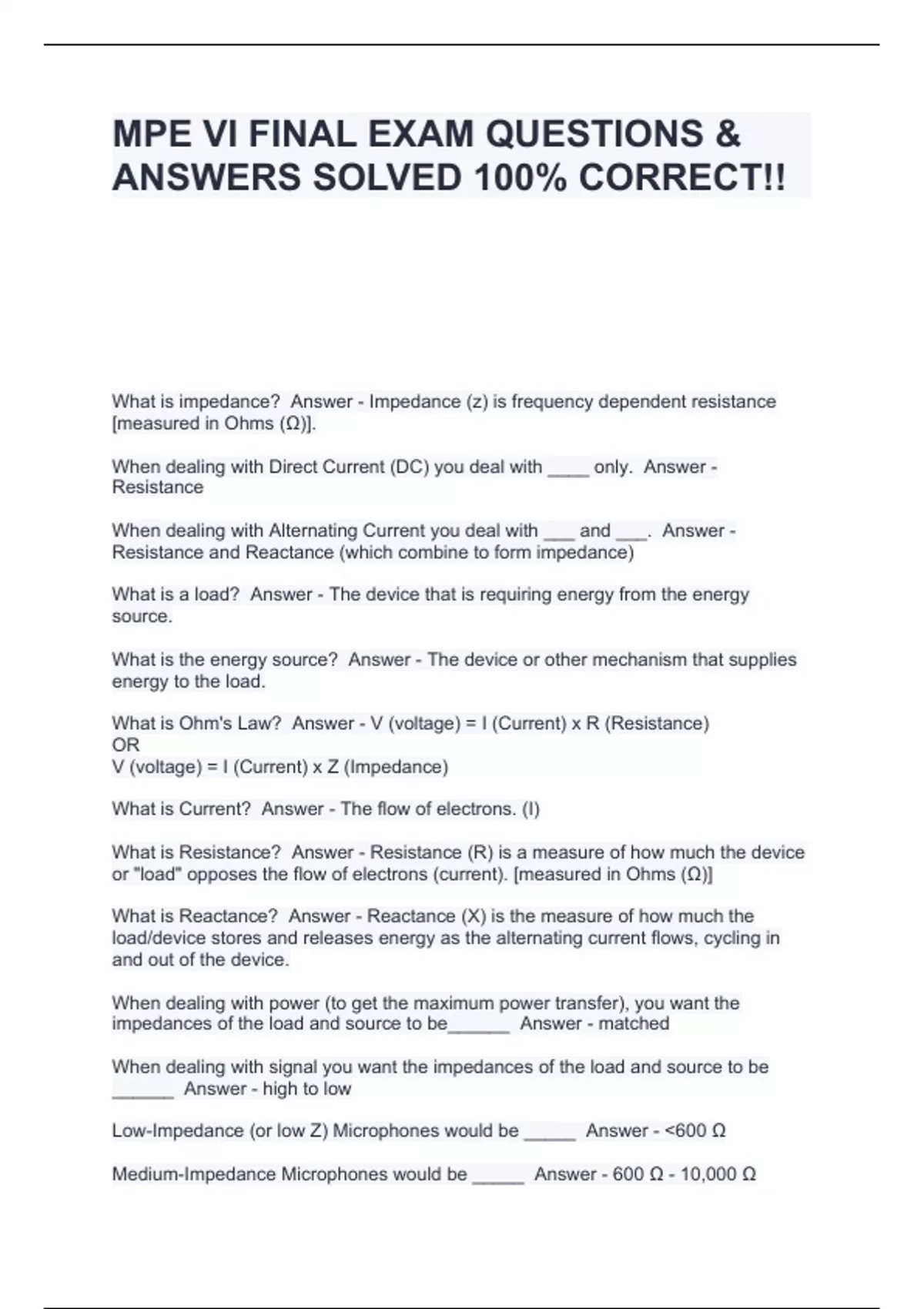 MPE VI FINAL EXAM QUESTIONS & ANSWERS SOLVED 100% CORRECT!!