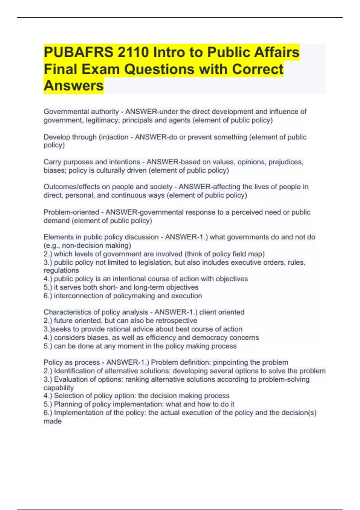 Governmental authority - ANSWER-under the direct development and influence of government, legitimacy; principals and agents (element of public policy) Develop through (in)action - ANSWER-do or prevent something (element of public policy) Carry purposes and intentions - ANSWER-based on values, opinions, prejudices, biases; policy is culturally driven (element of public policy) Outcomes/effects on people and society - ANSWER-affecting the lives of people in direct, personal, and continuous ways (element of public policy) Problem-oriented - ANSWER-governmental response to a perceived need or public demand (element of public policy) Elements in public policy discussion - ANSWER-1.) what governments do and not do (e.g., non-decision making) 2.) which levels of government are involved (think of policy field map) 3.) public policy not limited to legislation, but also includes executive orders, rules, regulations 4.) public policy is an intentional course of action with objectives 5.) it serves both short- and long-term objectives 6.) interconnection of policymaking and execution Characteristics of policy analysis - ANSWER-1.) client oriented 2.) future oriented, but can also be retrospective 3.)seeks to provide rational advice about best course of action 4.) considers biases, as well as efficiency and democracy concerns 5.) can be done at any moment in the policy making process Policy as process - ANSWER-1.) Problem definition: pinpointing the problem 2.) Identification of alternative solutions: developing several options to solve the problem 3.) Evaluation of options: ranking alternative solutions according to problem-solving capability 4.) Selection of policy option: the decision making process 5.) Planning of policy implementation: what and how to do it 6.) Implementation of the policy: the actual execution of the policy and the decision(s) made