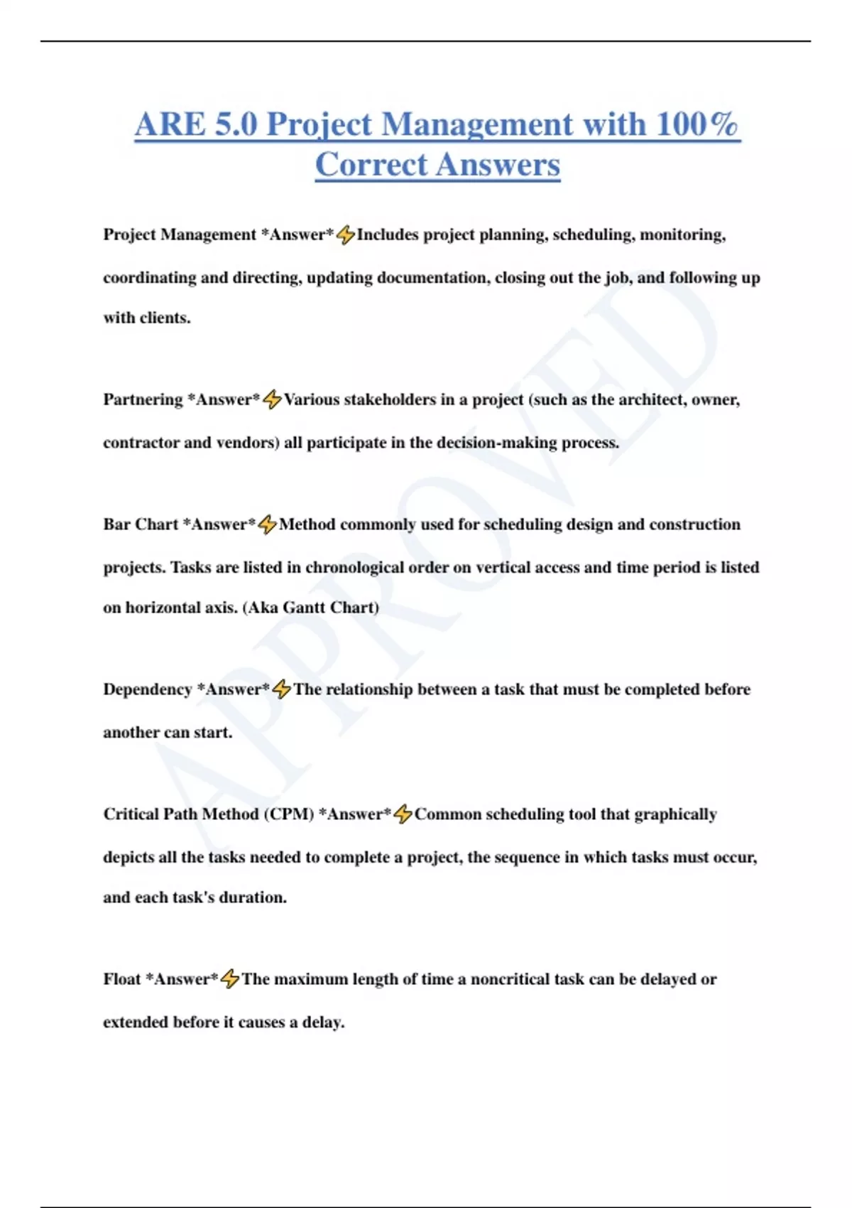 ARE 5.0 Project Management with 100% Correct Answers Project Management *Answer* Includes project planning, scheduling, monitoring, coordinating and directing, updating documentation, closing out the job, and following up with clients. Partnering *Answer* Various stakeholders in a project (such as the architect, owner, contractor and vendors) all participate in the decision-making process. Bar Chart *Answer* Method commonly used for scheduling design and construction projects. Tasks are listed in chronological order on vertical access and time period is listed on horizontal axis. (Aka Gantt Chart) Dependency *Answer* The relationship between a task that must be completed before another can start. Critical Path Method (CPM) *Answer* Common scheduling tool that graphically depicts all the tasks needed to complete a project, the sequence in which tasks must occur, and each task's duration. Float *Answer* The maximum length of time a noncritical task can be delayed or extended before it causes a delay. Work Plan *Answer* A detailed project schedule, breaking the project down into its component tasks and assigning staff members and other resources to each task. (Aka Fee projection) Pro Forma *Answer* Statement listing the expected income that the project will generate and the expected costs to build the project. Value Engineering *Answer* Reviewing individual systems and materials to see if the same function can be accomplished in a less expensive way. Building Cost *Answer* The money needed to construct the building, including structure, exterior cladding, finishes, and electrical and mechanical systems, as well as the contractor's overhead and profit. Site Development Costs *Answer* Cost of parking, drives, fences, landscaping, exterior lighting, and irrigation systems. Furniture, Fixtures, and Equipment (FF&E) *Answer* Costs of movable equipment, furnishings, accessories, and window coverings
