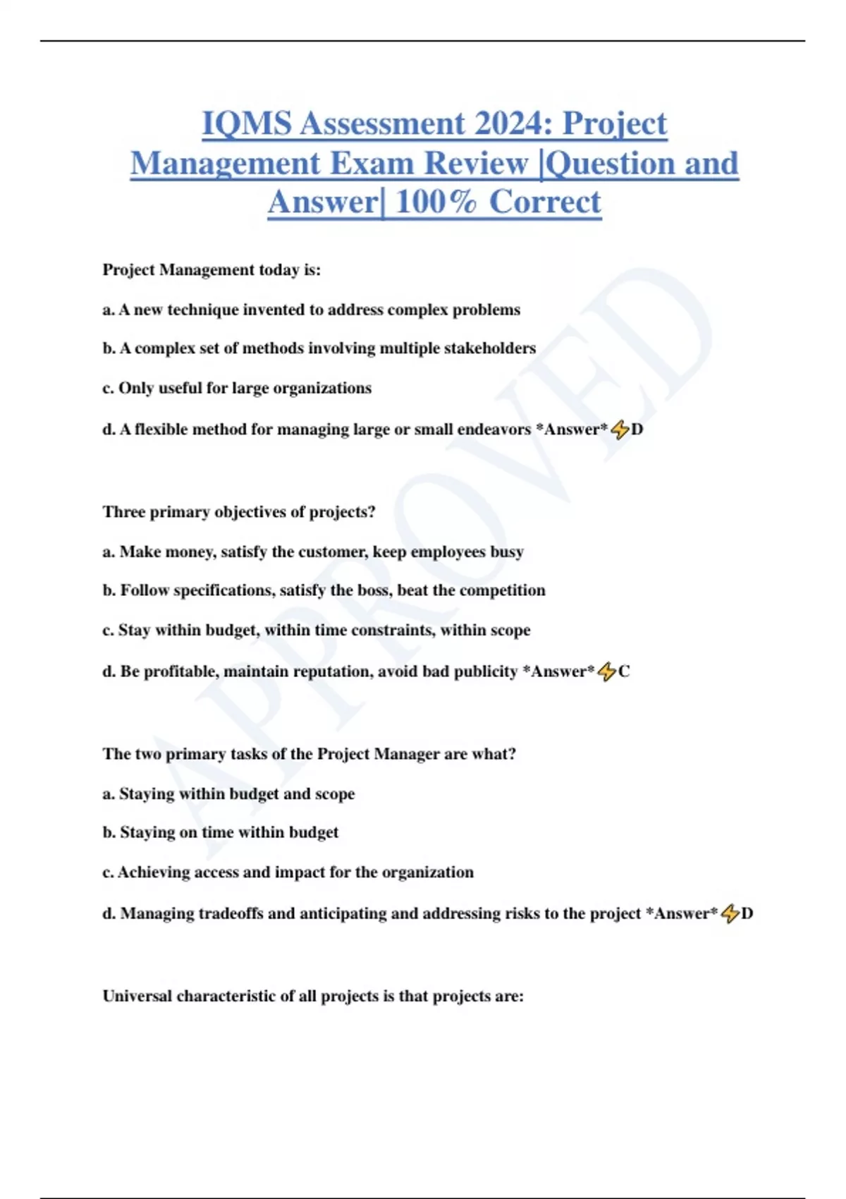 IQMS Assessment 2024: Project Management Exam Review |Question and Answer| 100% Correct Project Management today is: a. A new technique invented to address complex problems b. A complex set of methods involving multiple stakeholders c. Only useful for large organizations d. A flexible method for managing large or small endeavors *Answer* D Three primary objectives of projects? a. Make money, satisfy the customer, keep employees busy b. Follow specifications, satisfy the boss, beat the competition c. Stay within budget, within time constraints, within scope d. Be profitable, maintain reputation, avoid bad publicity *Answer* C The two primary tasks of the Project Manager are what? a. Staying within budget and scope b. Staying on time within budget c. Achieving access and impact for the organization d. Managing tradeoffs and anticipating and addressing risks to the project *Answer* D Universal characteristic of all projects is that projects are: a. Over budget b. Short on time c. Unique d. Difficult *Answer* C If the primary goal of a project is to produce 10 new widget designs, what might be an important ancillary goal? a. Determine skill and creativity level of the design department b. Demonstrate management commitment c. Make a profit d. Get a promotion *Answer* A What is a "Quasi-Project"? a. Project with variable outcomes matrix b. A situation in which all of the three primary project objectives are ill-defined c. Quick, uncomplicated, active service initiatives d. Recently added activity-reporting matrix *Answer* B Most of the credit for developing project management techniques belongs to: a. The military b. Project managers worldwide c. Large multinational organizations in the U.S. d. The project management institute *Answer*
