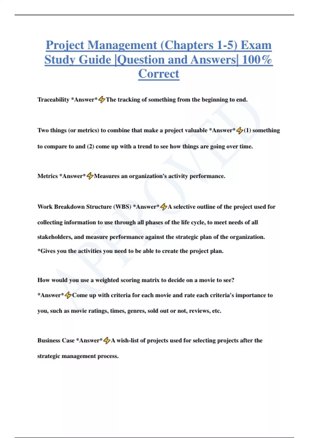 Project Management (Chapters 1-5) Exam Study Guide |Question and Answers| 100% Correct Traceability *Answer* The tracking of something from the beginning to end. Two things (or metrics) to combine that make a project valuable *Answer* (1) something to compare to and (2) come up with a trend to see how things are going over time. Metrics *Answer* Measures an organization's activity performance. Work Breakdown Structure (WBS) *Answer* A selective outline of the project used for collecting information to use through all phases of the life cycle, to meet needs of all stakeholders, and measure performance against the strategic plan of the organization. *Gives you the activities you need to be able to create the project plan. How would you use a weighted scoring matrix to decide on a movie to see? *Answer* Come up with criteria for each movie and rate each criteria's importance to you, such as movie ratings, times, genres, sold out or not, reviews, etc. Business Case *Answer* A wish-list of projects used for selecting projects after the strategic management process. 4 Items Included in a Business Case *Answer* (1) cost, (2) time, (3) how it's aligned with vision/goals, (4) risk. Work Package *Answer* The basic unit for planning, scheduling, and controlling the project. The lowest level of the WBS *Answer* Work package 6 Items Included in Each Work Package *Answer* (1) defines work - what (2) identifies time to complete a work package - how long (3) identifies and time-phased budget to complete work package - cost (4) identifies resources needed to complete a work package - how much (5) identifies a single person responsible for units of work - who (6) identifies monitoring points for measuring progress - how well Project Manager *Answer* Person who comes up with a business plan. Functional Manager *Answer* Person who figures out what projects to do that will support the company and comes up with a business case to justify that project. Another phrase for project selection *Answer* Vetting process