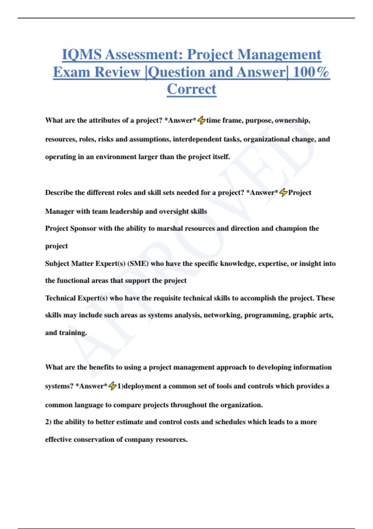 IQMS Assessment: Project Management Exam Review |Question and Answer| 100% Correct What are the attributes of a project? *Answer* time frame, purpose, ownership, resources, roles, risks and assumptions, interdependent tasks, organizational change, and operating in an environment larger than the project itself. Describe the different roles and skill sets needed for a project? *Answer* Project Manager with team leadership and oversight skills Project Sponsor with the ability to marshal resources and direction and champion the project Subject Matter Expert(s) (SME) who have the specific knowledge, expertise, or insight into the functional areas that support the project Technical Expert(s) who have the requisite technical skills to accomplish the project. These skills may include such areas as systems analysis, networking, programming, graphic arts, and training. What are the benefits to using a project management approach to developing information systems? *Answer* 1)deployment a common set of tools and controls which provides a common language to compare projects throughout the organization. 2) the ability to better estimate and control costs and schedules which leads to a more effective conservation of company resources. 3) improved communication and status reports leads giving the developers the ability to manage expectations of stakeholders. 4) competitive advantage for internal developers whose work might have to be outsourced if the quality and cost of their work can be bettered by outside competition. 5) efficiency and effectiveness can often be achieved resulting in shorter development times, lower costs, and higher quality. What are the advantages of having and following a project methodology? *Answer* 1) A project team can focus on the product or system without having to debate how the work is to be done. 2) Stakeholders understand their role, and these roles can be applied to future projects. 3) Experiences can be documented in terms of lessons learned and integrated into the methodology as best practices. Hopefully, previous successes can be repeated. 4) Past, present, and future projects can be compared with confidence in terms of planning and progress reporting. 5) Valuable time can be saved because approaches, tools, techniques, and templates can be reused across projects. 6) As you will learn in later chapters, following a methodology provides a useful template for planning the project work and associated tasks. Describe project integration management and its relationship to the other eight Project Management Body of Knowledge areas. *Answer* Project integration management is one of the most important Project Management Body of Knowledge areas. It coordinates