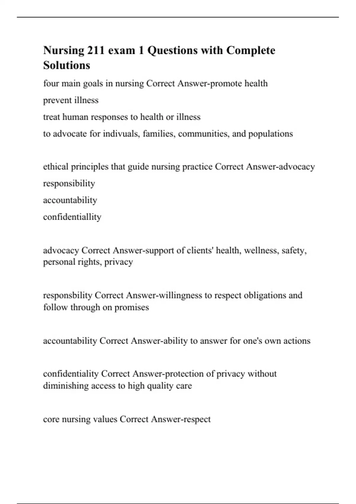 four main goals in nursing Correct Answer-promote health prevent illness treat human responses to health or illness to advocate for indivuals, families, communities, and populations ethical principles that guide nursing practice Correct Answer-advocacy responsibility accountability confidentiallity advocacy Correct Answer-support of clients' health, wellness, safety, personal rights, privacy responsbility Correct Answer-willingness to respect obligations and follow through on promises accountability Correct Answer-ability to answer for one's own actions confidentiality Correct Answer-protection of privacy without diminishing access to high quality care core nursing values Correct Ans