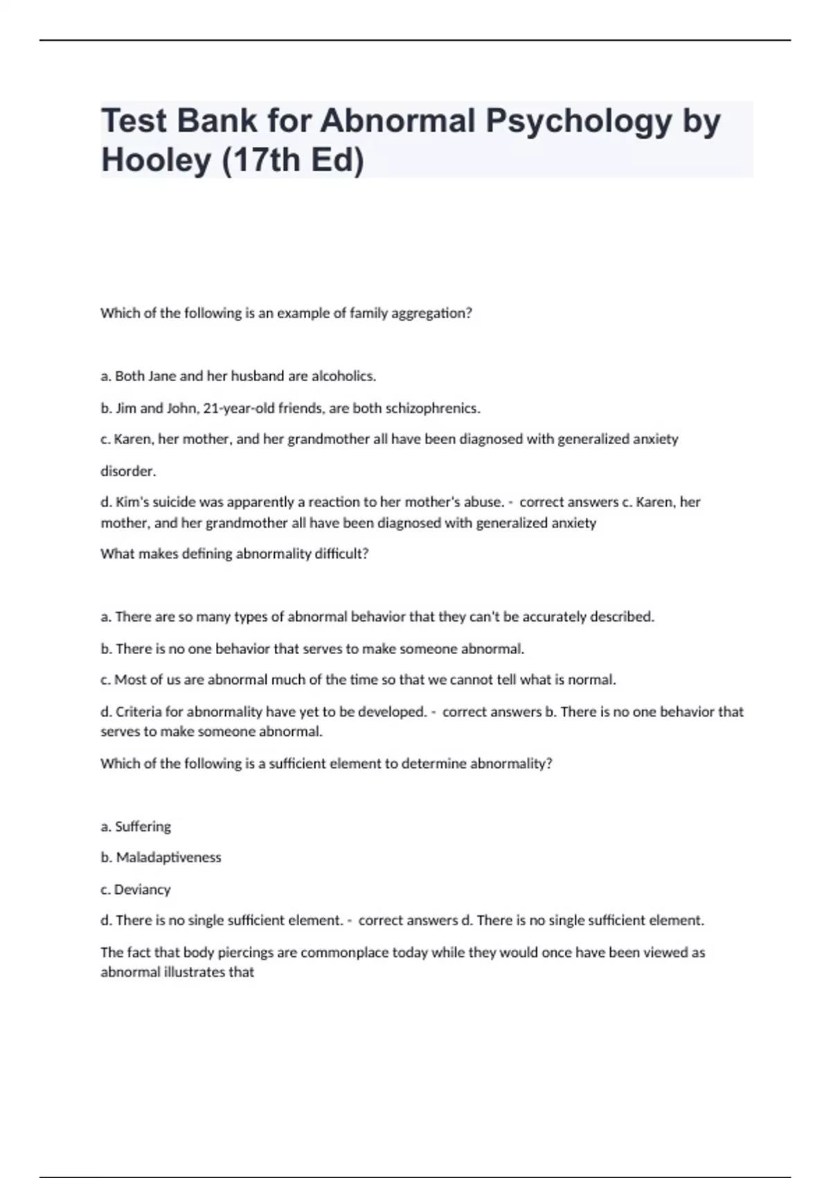 Test Bank for Abnormal Psychology by Hooley (17th Ed) Which of the following is an example of family aggregation? a. Both Jane and her husband are alcoholics. b. Jim and John, 21-year-old friends, are both schizophrenics. c. Karen, her mother, and her grandmother all have been diagnosed with generalized anxiety disorder. d. Kim's suicide was apparently a reaction to her mother's abuse. - correct answers c. Karen, her mother, and her grandmother all have been diagnosed with generalized anxiety What makes defining abnormality difficult? a. There are so many types of abnormal behavior that they can't be accurately described. b. There is no one behavior that serves to make someone abnormal. c. Most of us are abnormal much of the time so that we cannot tell what is normal. d. Criteria for abnormality have yet to be developed. - correct answers b. There is no one behavior that serves to make someone abnormal. Which of the following is a sufficient element to determine abnormality? a. Suffering b. Maladaptiveness c. Deviancy d. There is no single sufficient element. - correct answers d. There is no single sufficient element. The fact that body piercings are commonplace today while they would once have been viewed as abnormal illustrates that a. modern society is unlikely to change. b. what is acceptable for men and women is no longer different. c. American culture values independence. d. the values of a society may change over time. - correct answers d. the values of a society may change over time. Brett persistently injects himself with pain killers. This has greatly increased his chance of overdosing and dying. His behavior harms no one else. According to the DSM-5, is Brett's behavior consistent with the definition of a mental disorder? a. Yes, because many people in society engage in this behavior. b. Yes, because he is persistently acting in a way that harms him. c. No, because his behavior must also harm the well-being of others in the community. d. No, because there is no evidence that his actions are out of his own control. - correct answers b. Yes, because he is persistently acting in a way that harms him. According to the DSM, when is deviant behavior viewed as indicative of a mental disorder? a. Always b. Only when the behavior is inconsistent with cultural norms c. When it is a symptom of a dysfunction in the individual d. Never - correct answers c. When it is a symptom of a dysfunction in the individual In the field of abnormal psychology, what does DSM stand for? a. Disorders, Science, and the Mind b. Diagnostic and Statistical Manual c. Descriptors for the Science of the Mind d. Diagnostic Science of the Mind - correct answers b. Diagnostic and Statistical Manual Which of the following is included in the DSM-5? a. A discussion of the various causes of mental disorders