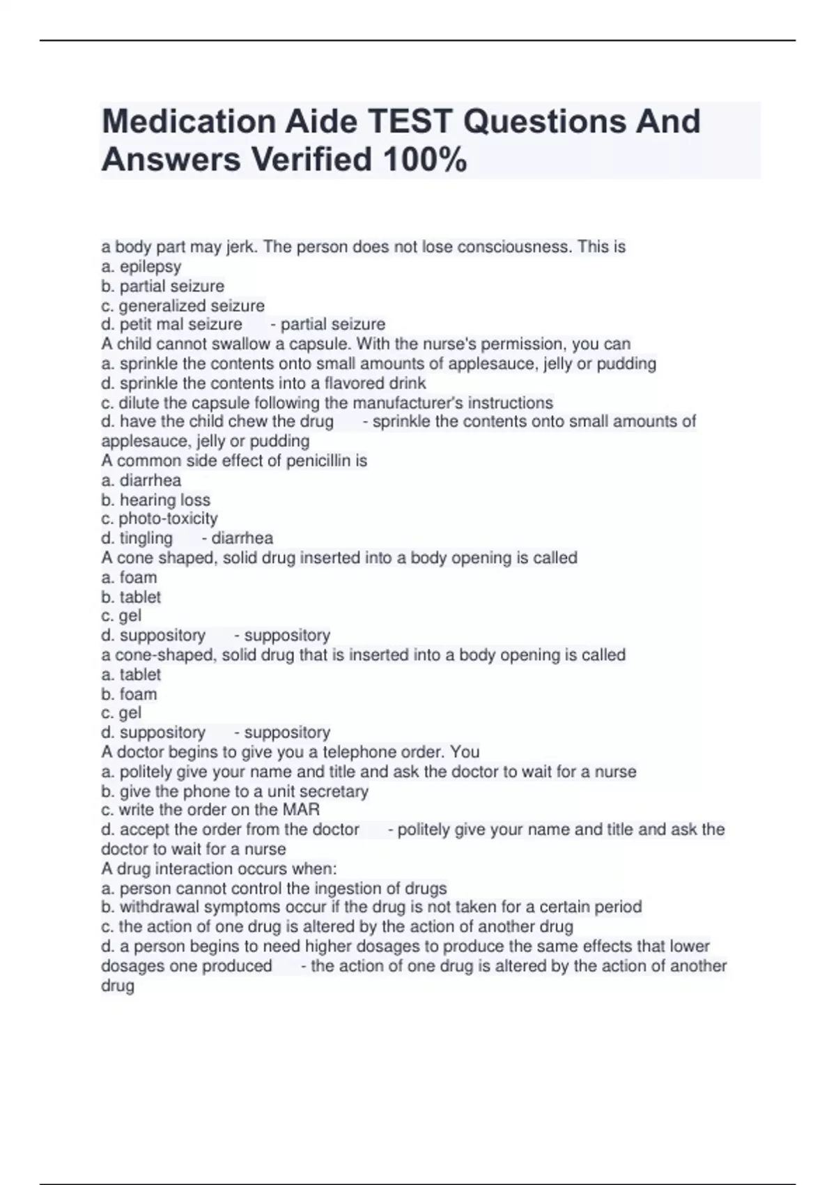 Medication Aide TEST Questions And Answers Verified 100% a body part may jerk. The person does not lose consciousness. This is a. epilepsy b. partial seizure c. generalized seizure d. petit mal seizure - partial seizure A child cannot swallow a capsule. With the nurse's permission, you can a. sprinkle the contents onto small amounts of applesauce, jelly or pudding d. sprinkle the contents into a flavored drink c. dilute the capsule following the manufacturer's instructions d. have the child chew the drug - sprinkle the contents onto small amounts of applesauce, jelly or pudding A common side effect of penicillin is a. diarrhea b. hearing loss c. photo-toxicity d. tingling - diarrhea A cone shaped, solid drug inserted into a body opening is called a. foam b. tablet c. gel d. suppository - suppository a cone-shaped, solid drug that is inserted into a body opening is called a. tablet b. foam c. gel d. suppository - suppository A doctor begins to give you a telephone order. You a. politely give your name and title and ask the doctor to wait for a nurse b. give the phone to a unit secretary c. write the order on the MAR d. accept the order from the doctor - politely give your name and title and ask the doctor to wait for a nurse A drug interaction occurs when: a. person cannot control the ingestion of drugs b. withdrawal symptoms occur if the drug is not taken for a certain period c. the action of one drug is altered by the action of another drug d. a person begins to need higher dosages to produce the same effects that lower dosages one produced - the action of one drug is altered by the action of another drug A drug is dispensed in a packed for each drug ordered. This is done with the a. floor stock system b. individual prescription order system c. unit dose system d. narcotic control system - unit dose system A drug is dropped on the floor. You should a. dispose of it following agency policy b. keep it for yourself. c. give it to the person d. return it to the drug box - dispose of it following agency policy A drug is given by the enteral route. You know that the drug is given a. into a vein b. into a muscle c. beneath the skin d. into the GI tract - into the GI tract A drug is given daily. What time should you put on the MAR? a. 0900 b. the agency's standard time for a drug given daily c. the time the drug was ordered d. the time preferred by the person - the agency's standard time for a drug given daily A drug is ordered p.c. this drug is given, a. after meals