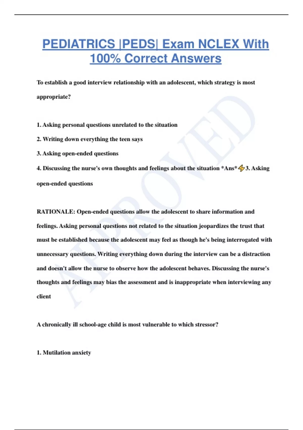 PEDIATRICS |PEDS| Exam NCLEX With 100% Correct Answers To establish a good interview relationship with an adolescent, which strategy is most appropriate? 1. Asking personal questions unrelated to the situation 2. Writing down everything the teen says 3. Asking open-ended questions 4. Discussing the nurse's own thoughts and feelings about the situation *Ans* 3. Asking open-ended questions RATIONALE: Open-ended questions allow the adolescent to share information and feelings. Asking personal questions not related to the situation jeopardizes the trust that must be established because the adolescent may feel as though he's being interrogated with unnecessary questions. Writing everything down during the interview can be a distraction and doesn't allow the nurse to observe how the adolescent behaves. Discussing the nurse's thoughts and feelings may bias the assessment and is inappropriate when interviewing any client A chronically ill school-age child is most vulnerable to which stressor? 1. Mutilation anxiety 2. Anticipatory grief 3. Anxiety over school absences 4. Fear of hospital procedures *Ans* 3. Anxiety over school absences RATIONALE: The school-age child is becoming industrious and attempts to master schoolrelated activities. Therefore, school absences are likely to cause extreme anxiety for a school-age child who's chronically ill. Mutilation anxiety is more common in adolescents. Anticipatory grief is rare in a school-age child. Fear of hospital procedures is most pronounced in preschool-age children. When developing a care plan for an adolescent, the nurse considers the child's psychosocial needs. During adolescence, psychosocial development focuses on: 1. becoming industrious. 2. establishing an identity. 3. achieving intimacy. 4. developing initiative. *Ans* 2. establishing an identity. RATIONALE: According to Erikson, the primary psychosocial task during adolescence is to establish a personal identity while overcoming role or identity confusion. The adolescent attempts to establish a group identity by seeking acceptance and approval from peers, and strives to attain a personal identity by becoming more independent from his family. Becoming industrious is the developmental task of the school-age child; achieving intimacy is the task of the young adult; and developing initiative is the task of the preschooler. A nurse notes that an infant develops arm movement before fine-motor finger skills and interprets this as an example of which pattern of development