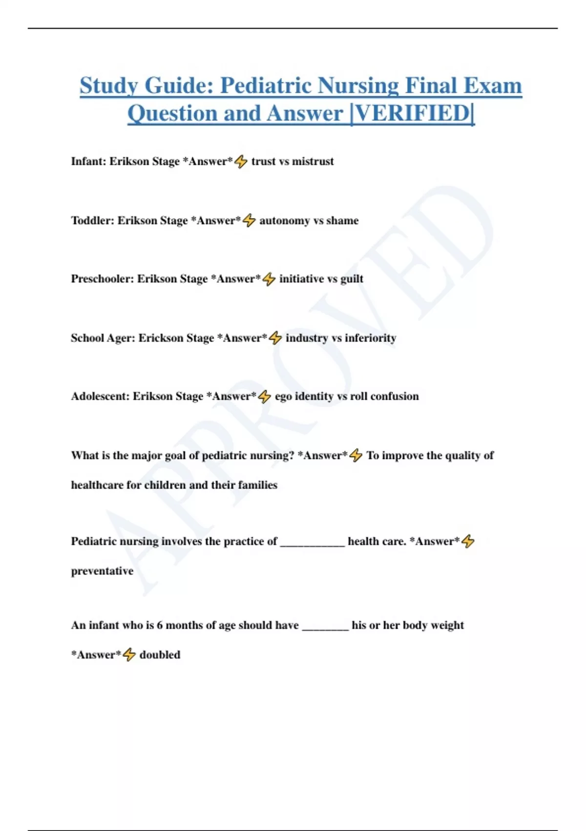 Study Guide: Pediatric Nursing Final Exam Question and Answer |VERIFIED| Infant: Erikson Stage *Answer* trust vs mistrust Toddler: Erikson Stage *Answer* autonomy vs shame Preschooler: Erikson Stage *Answer* initiative vs guilt School Ager: Erickson Stage *Answer* industry vs inferiority Adolescent: Erikson Stage *Answer* ego identity vs roll confusion What is the major goal of pediatric nursing? *Answer* To improve the quality of healthcare for children and their families Pediatric nursing involves the practice of ___________ health care. *Answer* preventative An infant who is 6 months of age should have ________ his or her body weight *Answer* doubled In which state of nutrition is lead-poisoning worse? *Answer* Anemia Motor development of a normal 6-month old. *Answer* Can transfer objects from one hand to another By _________ to ______ months of age, head control is well established. *Answer* 4 to 6 Blood-lead level of < 5 *Answer* reassess or rescreen 1 year, unless exposure status changes Blood-lead level > 70 *Answer* IMMEDIATELY provide medical treatment and begin coordination of care, clinical management, environmental investigation, and lead hazard control What is Chelation therapy? *Answer* use of a chemical compound that combines with the metal poisoning for rapid and safe excretion What two agents have been used for chelation therapy? *Answer* calcium disodium edetate (IM) and succimer (19 day oral tx) What are important nursing interventions with chelation therapy? *Answer* - renal, hepatic, and hematologic patterns should be monitored