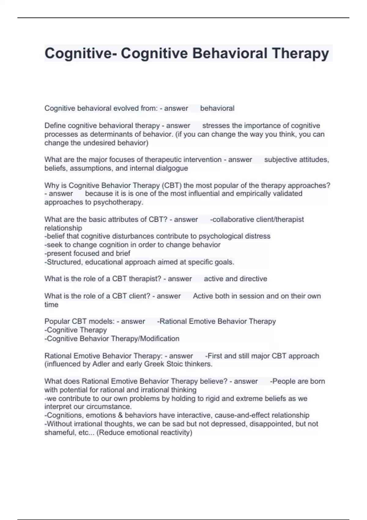 Cognitive- Cognitive Behavioral Therapy Questions and Answers 2024