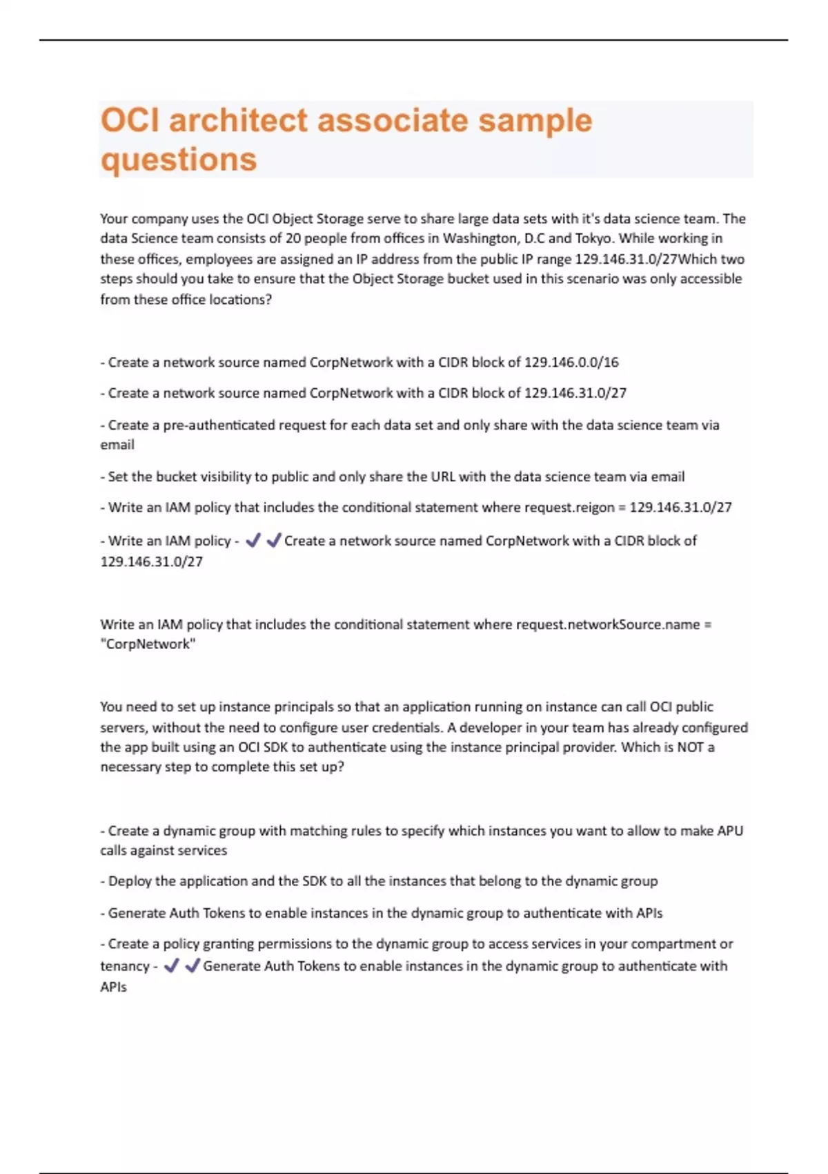 Your company uses the OCI Object Storage serve to share large data sets with it's data science team. The data Science team consists of 20 people from offices in Washington, D.C and Tokyo. While working in these offices, employees are assigned an IP address from the public IP range 129.146.31.0/27Which two steps should you take to ensure that the Object Storage bucket used in this scenario was only accessible from these office locations? - Create a network source named CorpNetwork with a CIDR block of 129.146.0.0/16 - Create a network source named CorpNetwork with a CIDR block of 129.146.31.0/27 - Create a pre-authenticated request for each data set and only share with the data science team via email - Set the bucket visibility to public and only share the URL with the data science team via email - Write an IAM policy that includes the conditional statement where n = 129.146.31.0/27 - Write an IAM policy - Create a network source named CorpNetwork with a CIDR block of 129.146.31.0/27 Write an IAM policy that includes the conditional statement where rkS = "CorpNetwork" You need to set up instance principals so that an application running on instance can call OCI public servers, without the need to configure user credentials. A developer in your team has already configured the app built using an OCI SDK to authenticate using the instance principal provider. Which is NOT a necessary step to complete this set up? - Create a dynamic group with matching rules to specify which instances you want to allow to make APU calls against services - Deploy the application and the SDK to all the instances that belong to the dynamic group - Generate Auth Tokens to enable instances in the dynamic group to authenticate with APIs - Create a policy granting permissions to the dynamic group to access services in your compartment or tenancy - Generate Auth Tokens to enable instances in the dynamic group to authenticate with APIs(tokens are associated with users) An Oracle Cloud Infrastructure tenancy administrator is not able to delete a user in the tenancy. What can cause the issue? - User is a member of an Identity and Access Management (IAM) group - Users can be blocked but not deleted - User needs to be deleted from federation identity provider before deleting from IAM - User has multi-factor authentication (MFA) enabled - User is a member of an Identity and Access Management (IAM) group You have compartments C and D under the root compartment in your OCI tenancy; compartment C contains a sub-compartment also named D. You are trying to move this sub-compartment D to the parent compartment D like shown in the picture, but the move fails. What is the reason for this error? - Sub-compartment D needs to be empty before it can be moved - You cannot move a sub compartment to another parent compartment - Both parent and child compartments cannot have the same name - You need to move all the compartments in the hierarchy to the new parent compartment - Both parent and child compartments cannot have the same name Which two are Regional resources in Oracle Cloud Infrastructure? - Ephemeral public IPs - Block volume backups - Compute images - Compartments - Dynamic Groups - Compartments Dynamic GroupsWhich two resources reside Exclusively in a single Oracle Cloud Infrastructure Availability Domain? - Identity and Access Management Groups - Web Application Firewall policy - Object Storage - Block volume - Compute instance - block volume compute instance together in same AD to decrease latency A customer launched a compute instance in the Virtual Cloud Network (VCN) which has an internet gateway, a service gateway, a default security lists and default route table. The customer opened up Port 22 in the security lists attached to the compute instance subnet, however is still unable to connect to compute instance using SSH. What action can resolve this issue? - Modify the route table attached with the VCN subnet in which the instance resides. Add a following route to the route table: Destination CIDR: 0.0.0.0/0, Target: Service Gateway (SGW) - Modify the security list associated with the VCN subnet in which the instance resides. Add a stateful egress rule to allow ICMP traffic in addition to the port 22. - Modify the route table associated with the VCN subnet in which the instance resides. Add a following route to the route table: Destination CIDR: 0..0.0/0, Target: Dynamic Routing Gateway (DRG) - Modify the - Modify the route table associated with the VCN subnet in which the instance resides. Add a following route to the route table: Destination CIDR: 0.0.0.0/0, Target: Internet Gateway (IGW) You are running a a mission-critical database application in Oracle Cloud Infrastructure(OCI). You take regular backups of your DB system to OCI object storage. Recently, you notice a failed database backup status in the console. What step can you take to determine the cause of the backup failure? - Make sure the database is not active and running while the backup is in progress- Ensure that your database host can connect to OCI Object Storage - Ensure the database archiving mode is set to NOARCHIVELOG - Don't restart the dcsagent program even if it has a status of stop/waiting - Ensure that your database host can connect to OCI Object Storage You are deploying a highly available web application in Oracle Cloud Infrastructure and have decided to use a public load balancer. The back-end web servers will be distributed across all three availability domains (ADs). How many subnets should you create to deliver a secure highly available application? - Two in total; one regional public subnet to host your back-end web servers and one regional private subnet to host your public load instance balancer - Two subnets in total; one regional private subnet to host your back-end web servers and your public load balancer - One subnet in total; one regional private subnet to host your back-end web servers and your public load balancer - Three subnet