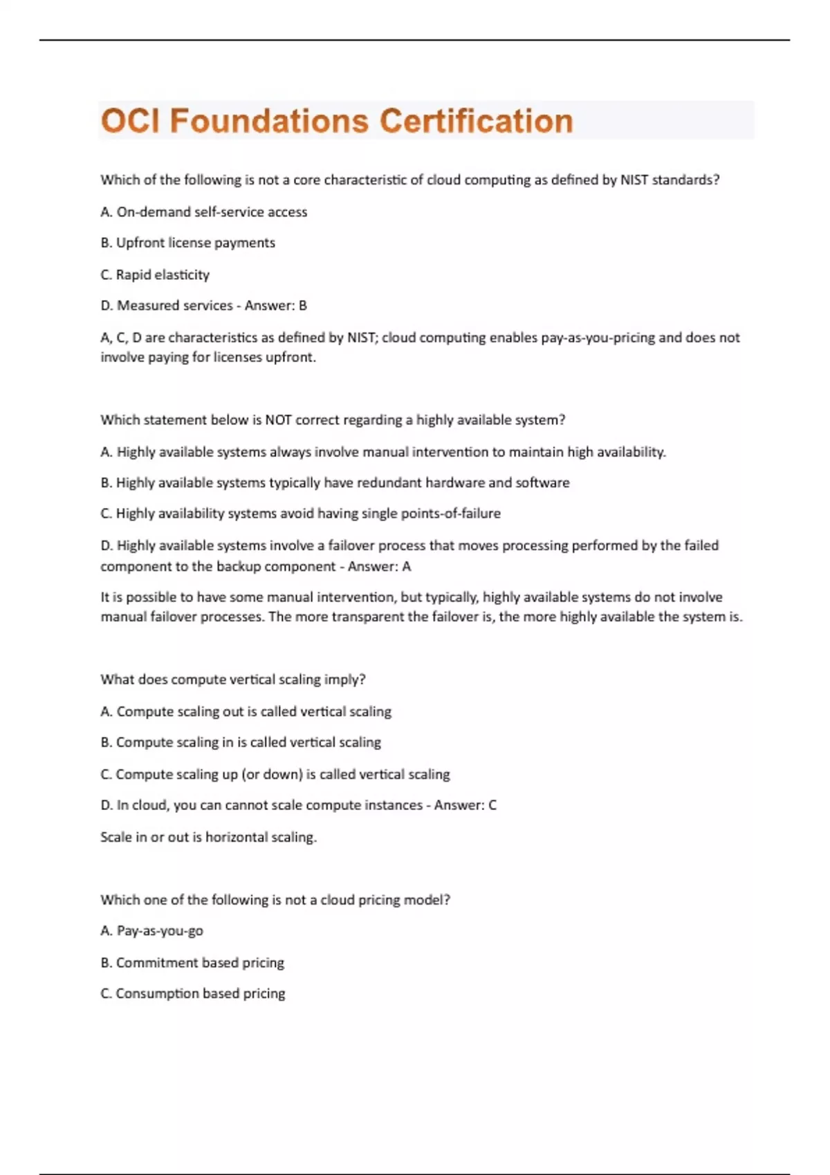 Which of the following is not a core characteristic of cloud computing as defined by NIST standards? A. On-demand self-service access B. Upfront license payments C. Rapid elasticity D. Measured services - Answer: B A, C, D are characteristics as defined by NIST; cloud computing enables pay-as-you-pricing and does not involve paying for licenses upfront. Which statement below is NOT correct regarding a highly available system? A. Highly available systems always involve manual intervention to maintain high availability. B. Highly available systems typically have redundant hardware and software C. Highly availability systems avoid having single points-of-failure D. Highly available systems involve a failover process that moves processing performed by the failed component to the backup component - Answer: A It is possible to have some manual intervention, but typically, highly available systems do not involve manual failover processes. The more transparent the failover is, the more highly available the system is. What does compute vertical scaling imply? A. Compute scaling out is called vertical scaling B. Compute scaling in is called vertical scaling C. Compute scaling up (or down) is called vertical scaling D. In cloud, you can cannot scale compute instances - Answer: C Scale in or out is horizontal scaling. Which one of the following is not a cloud pricing model? A. Pay-as-you-go B. Commitment based pricing C. Consumption based pricingD. Enterprise license based pricing - Answer: D Enterprise license based pricing is not a cloud pricing model, while the others are. In cloud computing, you only pay for resources that you use and in some cases, pay only for how much you consume. Which statement below is NOT true regarding an Oracle Cloud Infrastructure Region? A. Each region has at least one Availability Domain. B. Availability domains are isolated from each other and very unlikely to fail simultaneously. C. Each Fault Domain has multiple Availability Domains. D. Each Availability Domain has three Fault Domains. - Answer: C Each Availability Domain has three Fault Domains and not the other way around. Which two are valid reasons to use an Oracle Cloud Infrastructure Fault Domain? A. Protect against unexpected hardware or power supply failures B. Protect against planned hardware maintenance C. To mitigate the risk of large scale events such as earthquakes D. Build replicated systems for disaster recovery E. To meet requirements for legal jurisdictions - Answer: A, B You can use fault domains to (1) protect against unexpected hardware failures or power supply failures (2) protect against planned outages because of compute hardware maintenance. Which statement below is NOT true regarding Oracle Cloud Infrastructure High Availability Architecture? A. Fault Domains provide protection against failures within an Availability Domain B. In a multi-AD region, Availability Domain provides protection from an entire Availability Domain failure C. OCI region pair enables disaster recovery while meeting compliance and data residency requirements D. Compartments enable a high availability design within an Availability Domain - Answer: D A compartment is a collection of related resources and provides logical not physical isolation. Which two are valid reasons to deploy your apps in multiple Oracle Cloud Infrastructure regions?A. To mitigate the risk of region-wide events such as large weather systems or earthquakes B. To achieve high availability and real time data synchronization C. To meet varying requirements for legal jurisdictions, tax domains, and other business or social criteria D. To lower costs, as some OCI regions have lower pricing than others - Answer: A, C In OCI, pricing is not region-specific. In addition, if you deploy apps to multiple regions, you cannot achieve real-time data synchronization as regions can be separated by vast distances—across countries or even continents You have two web servers and a clustered database running in a single OCI Availability Domain. Which step below can help you achieve high availability? A. Group one web server and one database node in one fault domain and the other half of each pair in another fault domain B. OCI provides high availability by default, so you don't need to do anything C. Put both web servers in the same fault domain and database nodes in another fault domain D. Put both database nodes in the same fault domain and web servers in another fault domain - Answer: A Grouping web server and a database node and placing a pair in two separate fault domains ensure that a failure of any one fault domain does not result in an outage for your application. How do instances in Private Subnets in OCI Virtual Cloud Network communicate to Internet? A. Through a Service Gateway B. Through a Dynamic Routing Gateway C. Through a NAT Gateway D. Through an Internet gateway - Answer: C NAT is a networking technique commonly used to give an entire private network access to the internet without assigning each host a public IP address. OCI provides a managed NAT Gateway service that gives cloud resources without public IP addresses access to the internet without exposing those resources to incoming internet connections. Which of the following statement is true about VCN peering? A. A VCN peering connection is a networking connection between two VCNs within a single region. B. A VCN peering connection is a VPN-based connection.C. VCN peering does not require using any Gateways, Local or Remote D. Peered VCNs can exist in different regions. - Answer: D Remote Peering connects VCNs across regions You are setting up a proof of concept (POC) and need to cost-effectively establish a secure connection between an on-premises data center and Oracle Cloud Infrastructure (OCI). Which OCI service would you use? A. VPN Connect B. Service Gateway C. Internet Gateway D. FastConnect - Answer: A