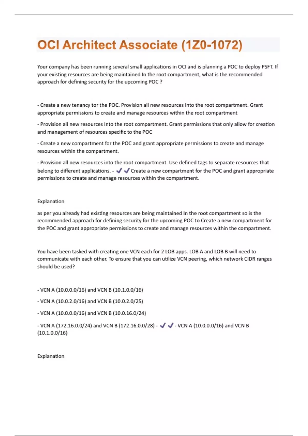 Your company has been running several small applications in OCI and is planning a POC to deploy PSFT. If your existing resources are being maintained In the root compartment, what is the recommended approach for defining security for the upcoming POC ? - Create a new tenancy tor the POC. Provision all new resources Into the root compartment. Grant appropriate permissions to create and manage resources within the root compartment - Provision all new resources Into the root compartment. Grant permissions that only allow for creation and management of resources specific to the POC - Create a new compartment for the POC and grant appropriate permissions to create and manage resources within the compartment. - Provision all new resources into the root compartment. Use defined tags to separate resources that belong to different applications. - Create a new compartment for the POC and grant appropriate permissions to create and manage resources within the compartment. Explanation as per you already had existing resources are being maintained In the root compartment so is the recommended approach for defining security for the upcoming POC to Create a new compartment for the POC and grant appropriate permissions to create and manage resources within the compartment. You have been tasked with creating one VCN each for 2 LOB apps. LOB A and LOB B will need to communicate with each other. To ensure that you can utilize VCN peering, which network CIDR ranges should be used? - VCN A (10.0.0.0/16) and VCN B (10.1.0.0/16) - VCN A (10.0.2.0/16) and VCN B (10.0.2.0/25) - VCN A (10.0.0.0/16) and VCN B (10.0.16.0/24) - VCN A (172.16.0.0/24) and VCN B (172.16.0.0/28) - - VCN A (10.0.0.0/16) and VCN B (10.1.0.0/16) ExplanationVCN A (10.0.0.0/16) will use a range of IPS from 10.0.0.0 to 10.0.255.255 and VCN B (10.1.0.0/16) will use a range of IPS from 10.1.0.0 to 10.1.255.255 so will not be any Overlap between 2 VCNs Which service would you use if your big data workload required shared access and NFS-based connectivity ? - Block Volume - Archive Storage - Object Storage - File Storage - - File Storage Explanation File Storage service is designed to meet the needs of applications and users that need an enterprise file system across a wide range of use cases, including the following: General Purpose File Storage: Access to an unlimited pool of file systems to manage growth of structured and unstructured data. Big Data and Analytics: Run analytic workloads and use shared file systems to store persistent data. Lift and Shift of Enterprise Applications: Migrate existing Oracle applications that need NFS storage, such as Oracle EBS and PSFT Databases and Transactional Applications: Run test and development workloads with Oracle, MySQL, or other databases. Backups, Business Continuity, and Disaster Recovery: Host a secondary copy of relevant file systems from on premises to the cloud for backup and disaster recovery purposes. MicroServices and Docker: Deliver stateful persistence for containers. Easily scale as your containerbased environments grow. You have hired a new employee to run reports from the ADW and are not confident in their SQL writing ability. Into which consumer group will you assign this Individual to minimize the impact of their code? - Low - Lowest - Medium- High - Highest - - Low Explanation in ADW, The file provided with the credentials zip file contains three database service names identifiable as high, medium, and low. The predefined service names provide different levels of performance and concurrency for ADW. • High - provides the highest level of resources to each SQL statement resulting in the highest performance, but supports the fewest number of concurrent SQL statements. Any SQL statement in this service can use all the CPU and IO resources in your database. The number of concurrent SQL statements that can be run in this service is 3, this number is independent of the number of OCPUs in your database. • MEDIUM - provides a lower level of resources to each SQL statement potentially resulting a lower level of performance, but supports more concurrent SQL statements. Any SQL statement in this service can use multiple CPU and IO resources in your database. The number of concurrent SQL statements that can be run in this service depends on the number of OCPUs in your database. • LOW - provides the least level of resources to each SQL statement, but supports the most number of concurrent SQL statements. Any SQL statement in this service can use a single CPU and multiple IO resources in your database. The number of concurrent SQL statements that can be run in this service can be up to 300 times the number of OCPUs. - The predefined service names provide different levels of performance and concurrency for Autonomous DB - Choose whichever database service offers the best balance of performance and concurrency. - Use the low database service name. to minimize the impact of their SQLs to by low consumer group You deployed a compute instance (VM.Standard2.16) to run a SQL database. After a few weeks, you need to increase disk performance by using NVMe disks; the number of CPUs will not change. As a first step you terminate the instance and preserve the boot volume. What is the next step? - Create a new instance using a VM.DenseIO2.16 shape using the preserved boot volume and move the SQL Database data to block volume - Create a new instance using a VM.DenseIO2.8 shape using the preserved boot volume and move the SQL Database data to NVMe disks - Create a new instance using a VM.Standard1.16 shape using the preserved boot volume and move the SQL Database data to NVMe disks- Create a new instance using a VM.DenseIO2.16 shape using the preserved boot volume move the SQL Database data to NVMe disks - - Create a new instance using a VM.DenseIO2.16 shape using the preserved boot volume move the SQL Database data to NVMe disks
