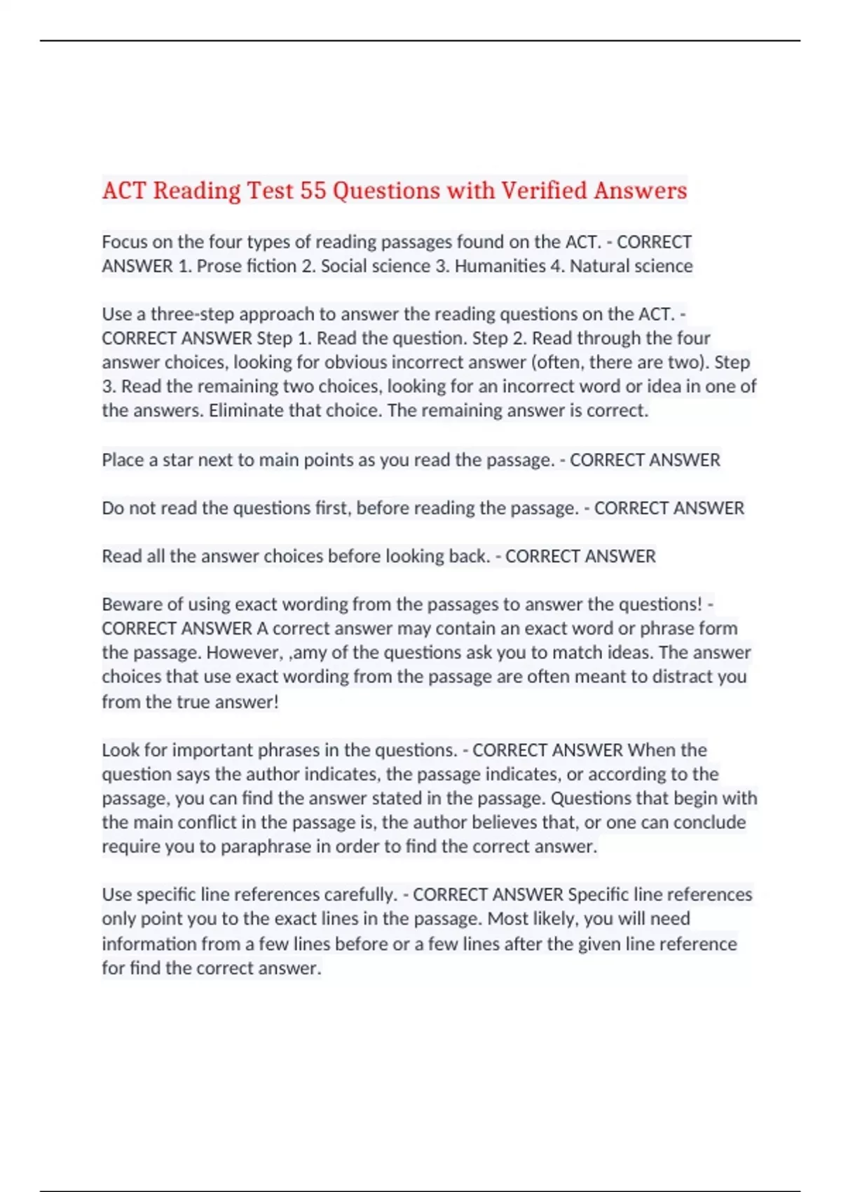 ACT Reading Test 55 Questions with Verified Answers Focus on the four types of reading passages found on the ACT. - CORRECT ANSWER 1. Prose fiction 2. Social science 3. Humanities 4. Natural science Use a three-step approach to answer the reading questions on the ACT. - CORRECT ANSWER Step 1. Read the question. Step 2. Read through the four answer choices, looking for obvious incorrect answer (often, there are two). Step 3. Read the remaining two choices, looking for an incorrect word or idea in one of the answers. Eliminate that choice. The remaining answer is correct. Place a star next to main points as you read the passage. - CORRECT ANSWER Do not read the questions first, before reading the passage. - CORRECT ANSWER Read all the answer choices before looking back. - CORRECT ANSWER Beware of using exact wording from the passages to answer the questions! - CORRECT ANSWER A correct answer may contain an exact word or phrase form the passage. However, ,amy of the questions ask you to match ideas. The answer choices that use exact wording from the passage are often meant to distract you from the true answer! Look for important phrases in the questions. - CORRECT ANSWER When the question says the author indicates, the passage indicates, or according to the passage, you can find the answer stated in the passage. Questions that begin with the main conflict in the passage is, the author believes that, or one can conclude require you to paraphrase in order to find the correct answer. Use specific line references carefully. - CORRECT ANSWER Specific line references only point you to the exact lines in the passage. Most likely, you will need information from a few lines before or a few lines after the given line reference for find the correct answer. Do not ignore conclusions. - CORRECT ANSWER Conclusions often clarify the main idea and help you answer some of the questions. The key to a good reading score is to read quickly and actively. You must stay focused while reading. Do not let your mind wander because you might miss important information. - CORRECT ANSWER For some students, the following strategy will speed up reading times. Be sute to practice before using it on the day of the real rest. Place the bottom edge of an index card at the top of the passage and move it down the lines, covering what you have just read. On test day, substitute your answer sheet in place of the index card. Pace yourself to finish the reading test. - CORRECT ANSWER You have 35 minutes to complete the reading section. In that time, you must complete 4 reading passages, each with 10 questions. It is best to use a little less than 9 minutes per passage. You should read each passage in no more than 4 minutes. Practice your pacing - CORRECT ANSWER practice with the watch you will use on test day; Time each passage; Do not rely on the proctor to inform you of the time. Not practicing can result in moving too slowly on the actual test. Use the assess and abandon strategy to answer some of the questions - CORRECT ANSWER The reading section always includes several very challenging questions. If you cannot find the answer quickly, abandon that questions and make an educated guess. Finishing the test is important because you are penalized for leaving blank answers. Fill in the same letter if you cannot finish the test. - CORRECT ANSWER It is best to fill in the blanks with the same letter. Doing this may give you a few more correct answers. For example in the reading section, choose middle letters such as B/G or C/H. Finding the main idea. - CORRECT ANSWER the main ideas in the prose fiction and humanities passages are usually connected to a character's attitude. The main ideas in the social science and natural science passages are usually stated at the end of the first paragraph. Look at the title to help you find the main idea. Prose fiction: Use the CAPS strategy. - CORRECT ANSWER Character Attitude Problem Solution C- Look for information regarding the characters A- Then look for attitudes. P-Determine what the problem (issue) S - Find the solution typically in the conclusion. Use the Caps strategy on the following short passage. - CORRECT ANSWER Social science: Find the author's purpose. - CORRECT ANSWER Look for the author's thesis or purpose in writing the passage. Then look at topic sentences to find the main idea of each paragraph. The purpose is usually stated at the end of the first paragraph. However, be aware that main ideas may not be directly stated but, instead, inferred or introduced in the following paragraphs. Find the author's purpose in the following short passage. - CORRECT ANSWER The author's purpose is to examine the work of John Marshall and come to a conclusion regarding this contributions. Always look for the purpose to direct your reading. Humanities: Look for the type of passage. - CORRECT ANSWER The humanities passage may be a memoir or narrative. It can also be factual like the social science passage. If the passage is a narrative, use the CAPS strategy. If the passage is factual, be aware of the topic sentences and the location of details. Which reading strategy should you use for each of the following humanities passes? - CORRECT ANSWER Natural science: Focus on the location of details. - CORRECT ANSWER The natural science passage is factual and filled with details. However, you do not need to learn every detail because doing so takes too much time. Look for the main idea. Mark the location of details so you can find them easily when you need them. If time is short, answer the questions with specific line references first. What is the reading test designed to measure? - CORRECT ANSWER Reading Comprehension How many questions? - CORRECT ANSWER 40 How many passages? - CORRECT ANSWER 4 How many questions per passage? - CORRECT ANSWER 10 How long to complete entire reading test? - CORRECT ANSWER 35 minutes How long should you spend reading and answering questions for each passage? - CORRECT ANS