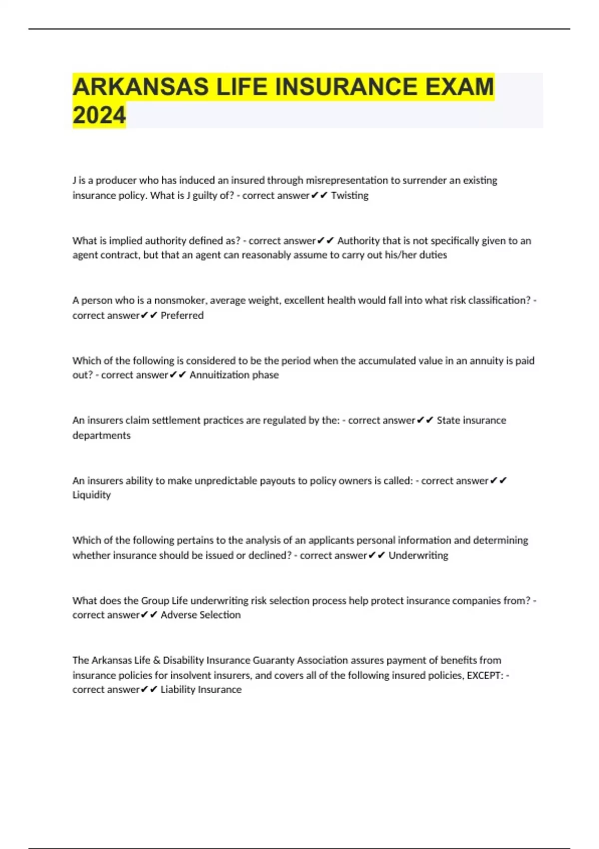 ARKANSAS LIFE INSURANCE EXAM 2024 J is a producer who has induced an insured through misrepresentation to surrender an existing insurance policy. What is J guilty of? - correct answer Twisting What is implied authority defined as? - correct answer Authority that is not specifically given to an agent contract, but that an agent can reasonably assume to carry out his/her duties A person who is a nonsmoker, average weight, excellent health would fall into what risk classification? - correct answer Preferred Which of the following is considered to be the period when the accumulated value in an annuity is paid out? - correct answer Annuitization phase An insurers claim settlement practices are regulated by the: - correct answer State insurance departments An insurers ability to make unpredictable payouts to policy owners is called: - correct answer Liquidity Which o