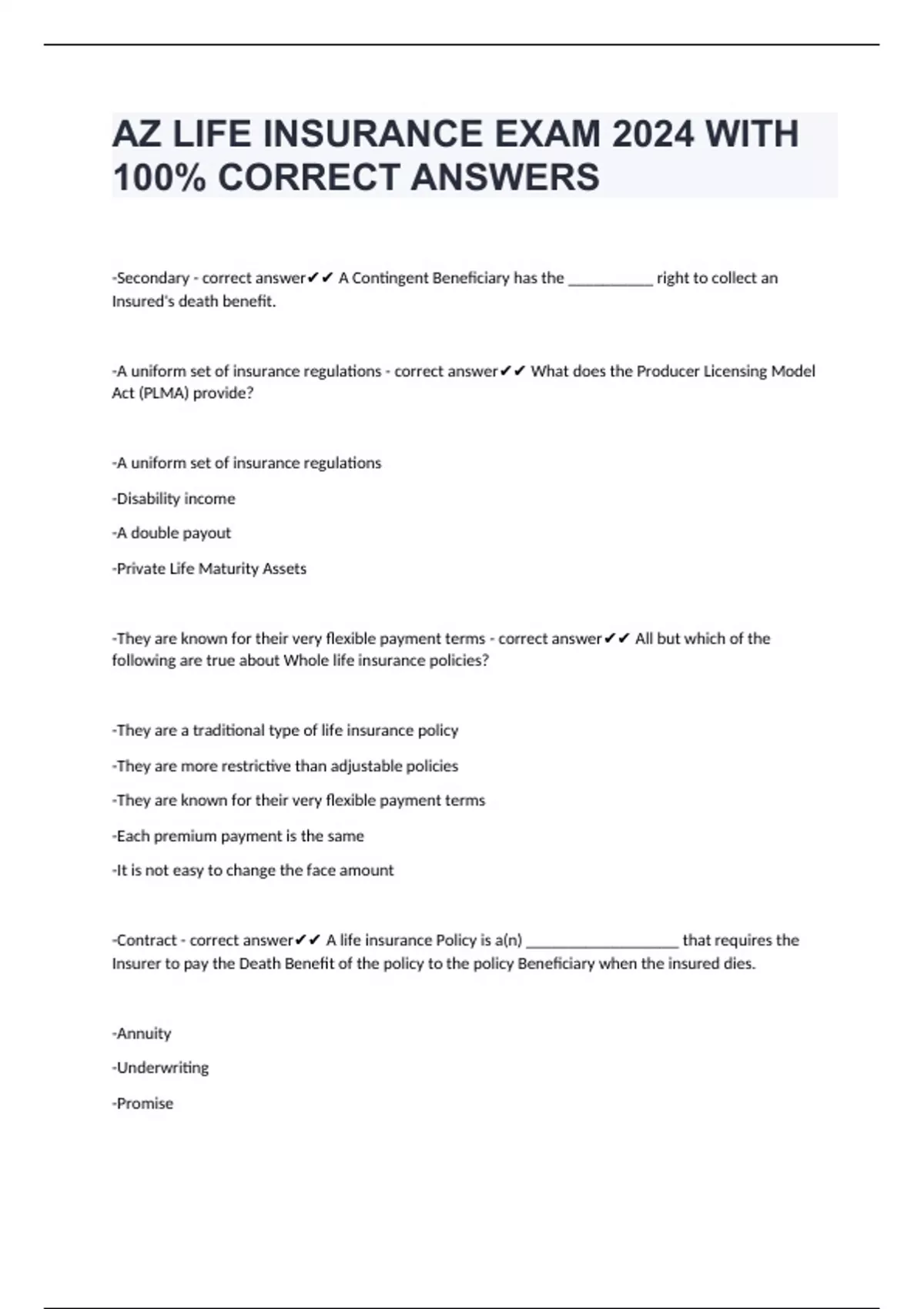 AZ LIFE INSURANCE EXAM 2024 WITH 100% CORRECT ANSWERS -Secondary - correct answer A Contingent Beneficiary has the __________ right to collect an Insured's death benefit. -A uniform set of insurance regulations - correct answer What does the Producer Licensing Model Act (PLMA) provide? -A uniform set of insurance regulations -Disability income -A double payout -Private Life Maturity Assets -They are known for their very flexible payment terms - correct answer All but which of the following are true about Whole life insurance policies? -They are a traditional type of life insurance policy -They are more restrictive than adjustable policies -They are known for their very flexible payment terms -Each premium payment is the same -It is not easy to change the face amount -Contract - correct answer A life insurance Policy is a(n) __________________ that requires the Insurer to pay the Death Benefit of the policy to the policy Beneficiary when the insured dies.
