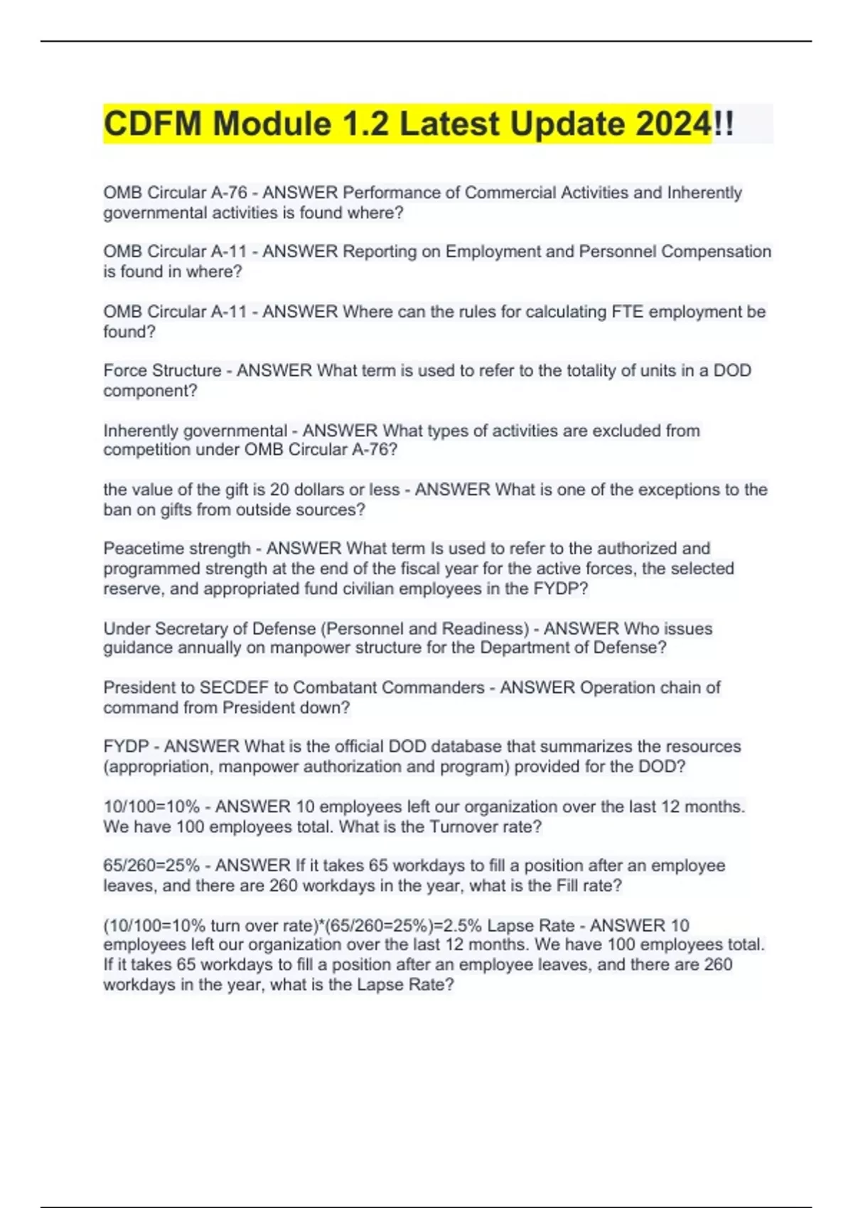 CDFM Module 1.2 Latest Update 2024!! OMB Circular A-76 - ANSWER Performance of Commercial Activities and Inherently governmental activities is found where? OMB Circular A-11 - ANSWER Reporting on Employment and Personnel Compensation is found in where? OMB Circular A-11 - ANSWER Where can the rules for calculating FTE employment be found? Force Structure - ANSWER What term is used to refer to the totality of units in a DOD component? Inherently governmental - ANSWER What types of activities are excluded from competition under OMB Circular A-76?