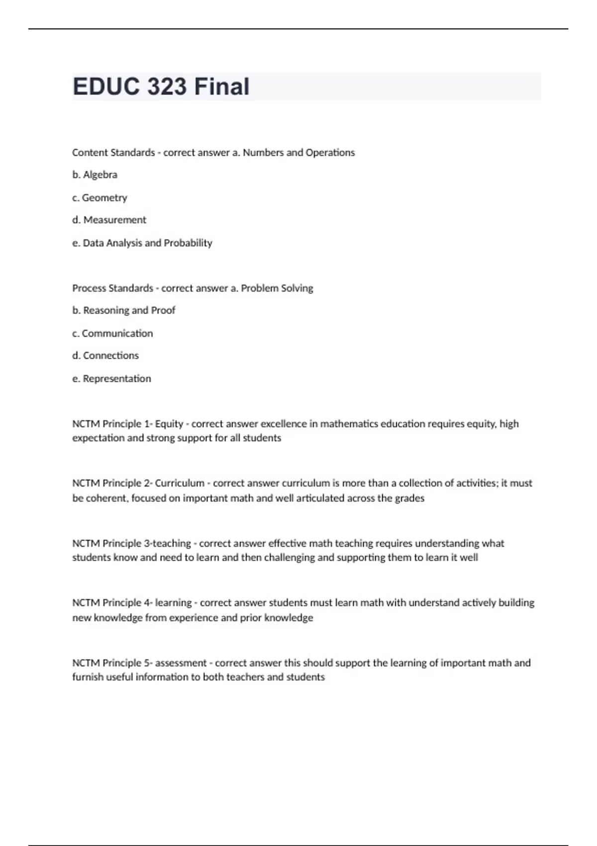 EDUC323 Liberty University -Final verified/passedContent Standards - correct answer a. Numbers and Operations b. Algebra c. Geometry d. Measurement e. Data Analysis and Probability Process Standards - correct answer a. Problem Solving b. Reasoning and Proof c. Communication d. Connections e. Representation NCTM Principle 1- Equity - correct answer excellence in mathematics education requires equity, high expectation and strong support for all students NCTM Principle 2- Curriculum - correct answer curriculum is more than a collection of activities; it must be coherent, focused on important math and well articulated across the grades NCTM Principle 3-teaching - correct answer effective math teaching requires understanding what students know and need to learn and then challenging and supporting them to learn it well