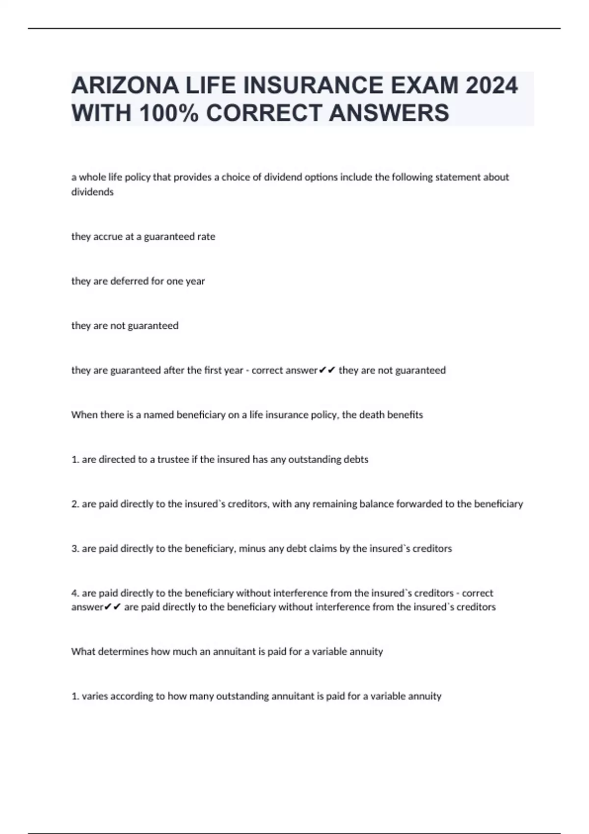 ARIZONA LIFE INSURANCE EXAM 2024 WITH 100% CORRECT ANSWERS a whole life policy that provides a choice of dividend options include the following statement about dividends they accrue at a guaranteed rate they are deferred for one year they are not guaranteed they are guaranteed after the first year - correct answer they are not guaranteed When there is a named beneficiary on a life insurance policy, the death benefits 1. are directed to a trustee if the insured has any outstanding debts 2. are paid directly to the insured`s creditors, with any remaining balance forwarded to the beneficiary 3. are paid directly to the beneficiary, minus any debt claims by the insured`s creditors 4