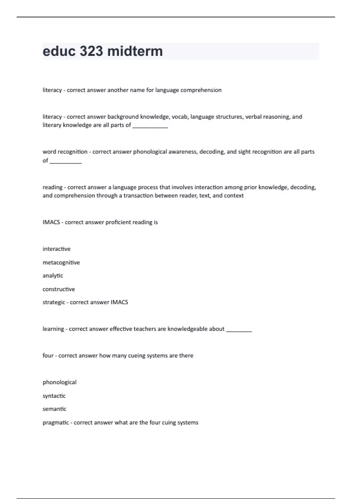 educ323 Liberty University -literacy - correct answer another name for language comprehension literacy - correct answer background knowledge, vocab, language structures, verbal reasoning, and literary knowledge are all parts of ___________ word recognition - correct answer phonological awareness, decoding, and sight recognition are all parts of __________ reading - correct answer a language process that involves interaction among prior knowledge, decoding, and comprehension through a transaction between reader, text, and context IMACS - correct answer proficient reading is interactive metacognitive analytic constructive strategic - correct answer IMACS learning - correct answer effective teachers are knowledgeable about ________ four - correct answer how many cueing systems are there