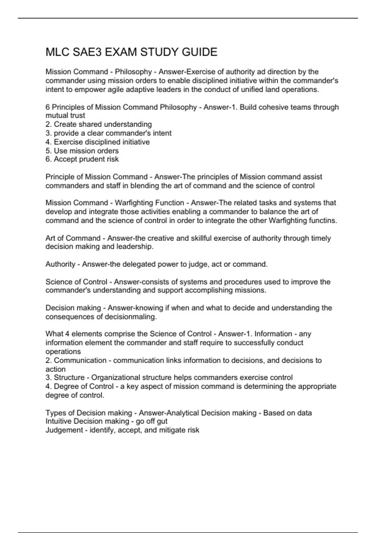 Mission Command - Philosophy - Answer-Exercise of authority ad direction by the commander using mission orders to enable disciplined initiative within the commander's intent to empower agile adaptive leaders in the conduct of unified land operations. 6 Principles of Mission Command Philosophy - Answer-1. Build cohesive teams through mutual trust 2. Create shared understanding 3. provide a clear commander's intent 4. Exercise disciplined initiative 5. Use mission orders 6. Accept prudent risk Principle of Mission Command - Answer-The principles of Mission command assist commanders and staff in blending the art of command and the science of control Mission Command - Warfighting Function - Answer-The related tasks and systems that develop and integrate those activities enabling a commander to balance the art of command and the science of control in order to integrate the other Warfighting functins. Art of Command - Answer-the creative and skillful exercise of authority through timely decision making and leadership. Authority - Answer-the delegated power to judge, act or command. Science of Control - Answer-consists of systems and procedures used to improve the commander's understanding and support accomplishing missions. Decision making - Answer-knowing if when and what to decide and understanding the consequences of decisionmaling. What 4 elements comprise the Science of Control - Answer-1. Information - any information element the commander and staff require to successfully conduct operations 2. Communication - communication links information to decisions, and decisions to action 3. Structure - Organizational structure helps commanders exercise control 4. Degree of Control - a key aspect of mission command is determining the appropriate degree of co