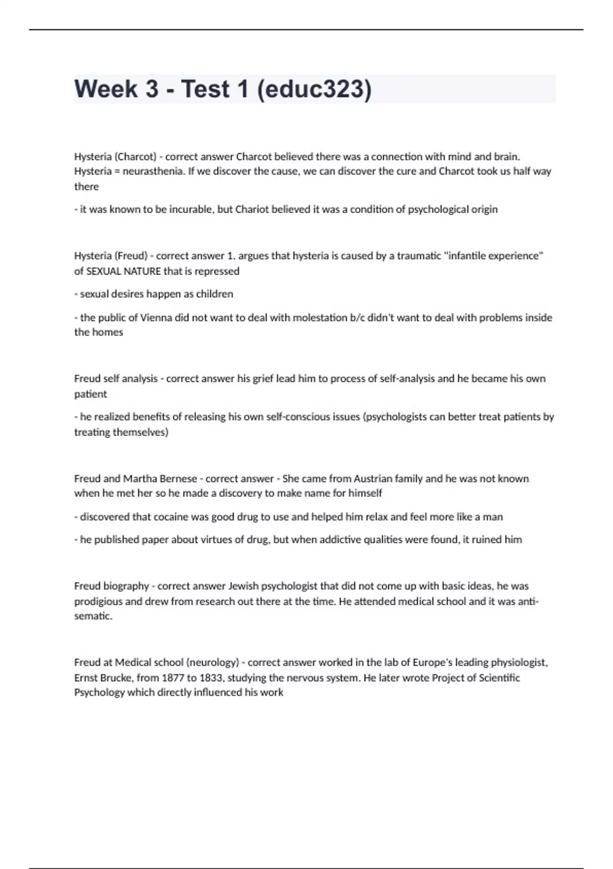 educ323 Liberty University -Week 3 - Test 1 (educ323) questions with answers rated A+ Hysteria (Charcot) - correct answer Charcot believed there was a connection with mind and brain. Hysteria = neurasthenia. If we discover the cause, we can discover the cure and Charcot took us half way there - it was known to be incurable, but Chariot believed it was a condition of psychological origin Hysteria (Freud) - correct answer 1. argues that hysteria is caused by a traumatic "infantile experience" of SEXUAL NATURE that is repressed - sexual desires happen as children - the public of Vienna did not want to deal with molestation b/c didn't want to deal with problems inside the homes Freud self analysis - correct answer his grief lead him to process of self-analysis and he became his own patient - he realized benefits of releasing his own self-conscious issues (psychologists can better treat patients by treating themselves) Freud and Martha Bernese - correct answer - She came from Austrian family and he was not known when he met her so he made a discovery to make name for himself - discovered that cocaine was good drug to use and helped him relax and feel more like a man - he published paper about virtues of drug, but when addictive qualities were found, it ruined him Freud biography - correct answer Jewish psychologist that did not come up with basic ideas, he was prodigious and drew from research out there at the time. He attended medical school and it was anti-sematic. Freud at Medical school (neurology) - correct answer worked in the lab of Europe's leading physiologist, Ernst Brucke, from 1877 to 1833, studying the nervous system. He later wrote Project of Scientific Psychology which directly influenced his work