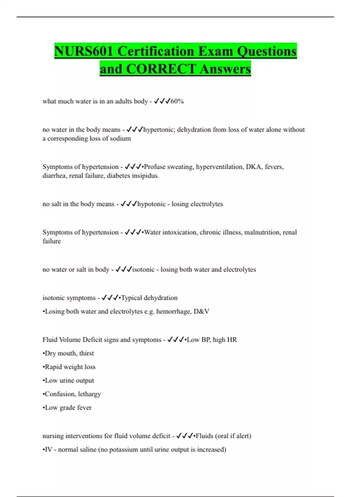 what much water is in an adults body - 60% no water in the body means - hypertonic; dehydration from loss of water alone without a corresponding loss of sodium Symptoms of hypertension - •Profuse sweating, hyperventilation, DKA, fevers, diarrhea, renal failure, diabetes insipidus. no salt in the body means - hypotonic - losing electrolytes Symptoms of hypertension - •Water intoxication, chronic illness, malnutrition, renal failure no water or salt in body - isotonic - losing both water and electrolytes isotonic symptoms - •Typical dehydration •Losing both water and electrolytes e.g. hemorrhage, D&V