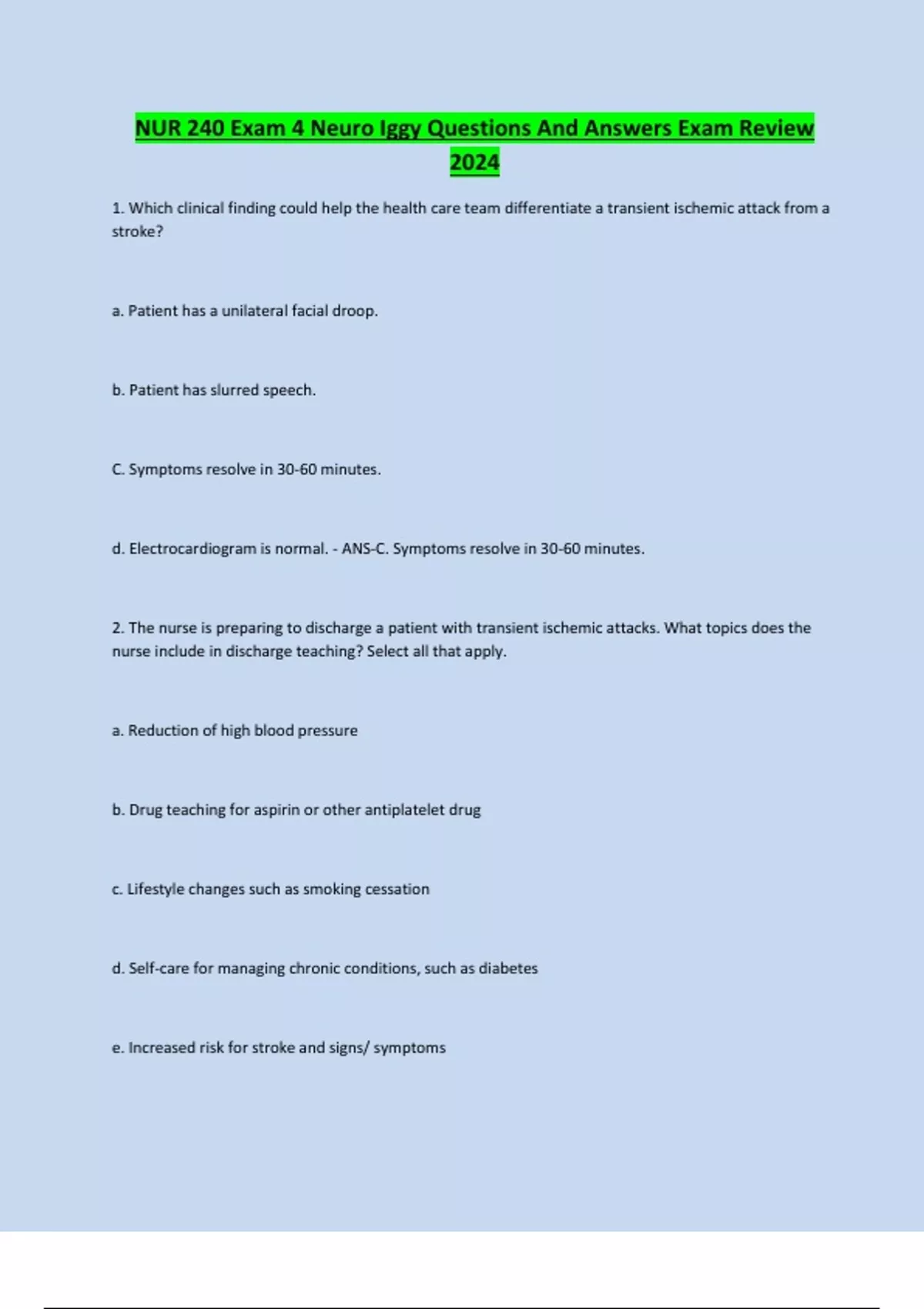 NUR 240 Exam 4 Neuro Iggy Questions And Answers Exam Review 2024 1. Which clinical finding could help the health care team differentiate a transient ischemic attack from a stroke? a. Patient has a unilateral facial droop. b. Patient has slurred speech. C. Symptoms resolve in 30-60 minutes. d. Electrocardiogram is normal. - ANS-C. Symptoms resolve in 30-60 minutes. 2. The nurse is preparing to discharge a patient with transient ischemic attacks. What topics does the nurse include in discharge teaching? Select all that apply. a. Reduction of high blood pressure b. Drug teaching for aspirin or other antiplatelet drug c. Lifestyle changes such as smoking cessation d. Self-care for managing chronic conditions, such as diabetes e. Increased risk for stroke and signs/ symptoms f. Benefits of taking vitamin supplements - ANS-a. Reduction of high blood pressure b. Drug teaching for aspirin or other antiplatelet drug c. Lifestyle changes such as smoking cessation d. Self-care for managing chronic conditions, such as diabetes e. Increased risk for stroke and signs/ symptoms 3. The home health nurse is assessing a patient who had a stroke that affected the right hemisphere. What would the nurse expect to observe? a. Patient is overly anxious and cautious when asked to do a new task. b. Patient is euphoric and smiling but disoriented to person, place, and time. c. Patient is depressed and expresses ongoing worries about the future. d. Patient has a flat affect but is able to answer most questions appropriately. - ANS-b. Patient is euphoric and smiling but disoriented to person, place, and time. 4. The nurse is assessing a patient who was brought to the emergency department for altered mental status. In the absence of family members or witnesses to give a history, what does the nurse do to identify two conditions that could mimic emergent neurologic conditions?... Continues...