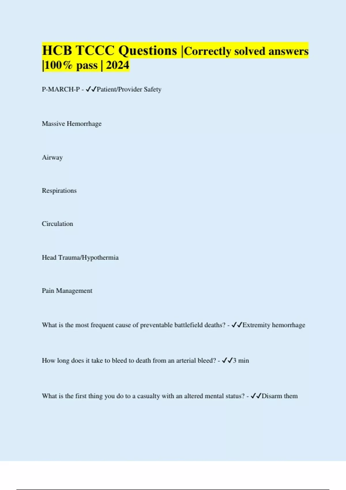 HCB TCCC Questions |Correctly solved answers |100% pass | 2024