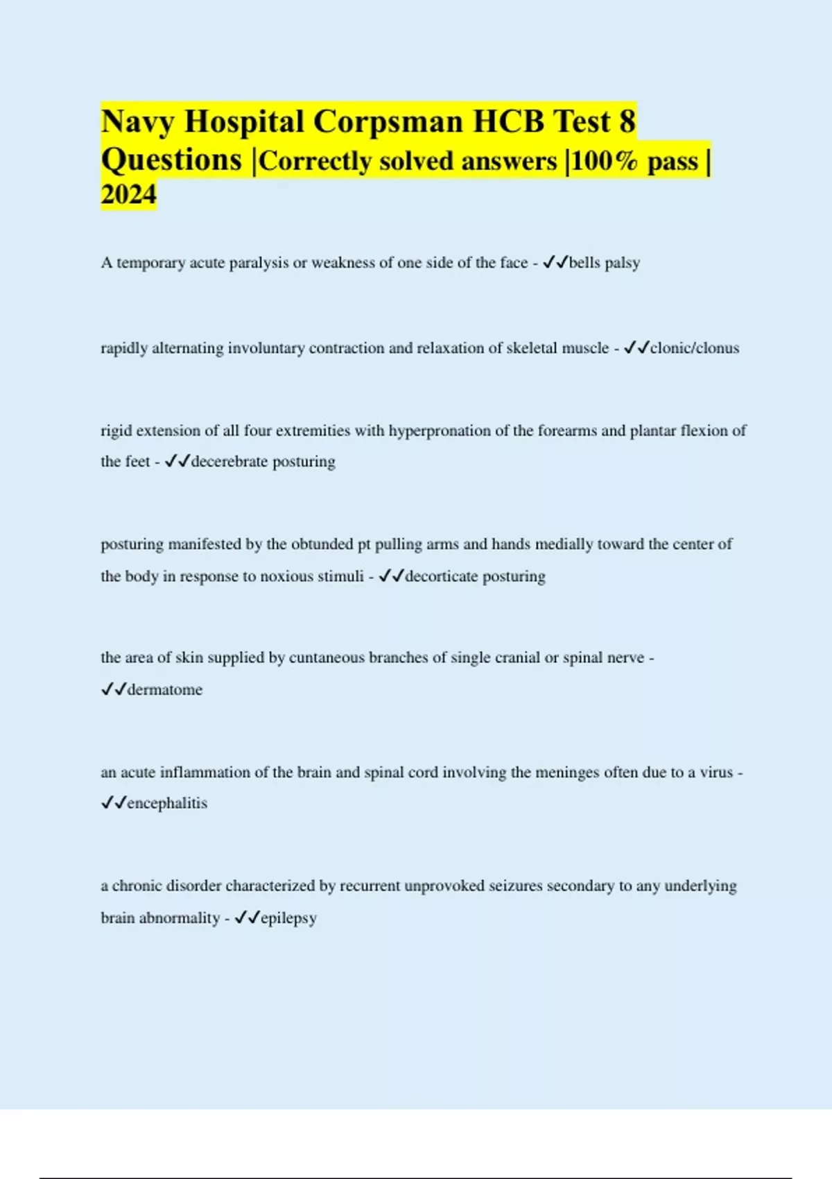 Navy Hospital Corpsman HCB Test 8 Questions |Correctly solved answers |100% pass | 2024
