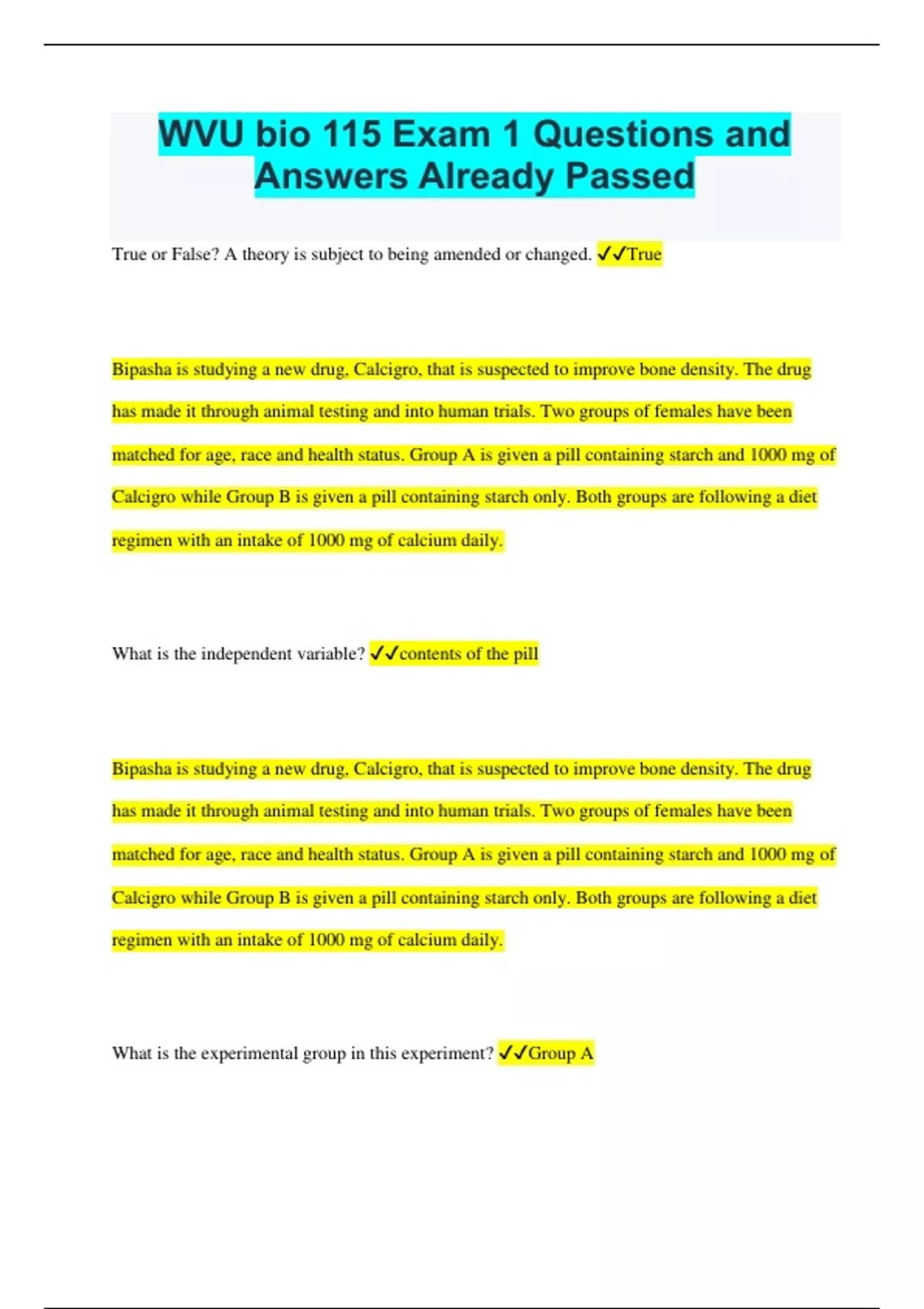 WVU bio 115 Exam 1 Questions and Answers Already Passed True or False? A theory is subject to being amended or changed. True Bipasha is studying a new drug, Calcigro, that is suspected to improve bone density. The drug has made it through animal testing and into human trials. Two groups of females have been matched for age, race and health status. Group A is given a pill containing starch and 1000 mg of Calcigro while Group B is given a pill containing starch only. Both groups are following a diet regimen with an intake of 1000 mg of calcium daily. What is the independent variable? contents of the pill Bipasha is studying a new drug, Calcigro, that is suspected to improve bone density. The drug has made it through animal testing and into human trials. Two groups of females have been matched for age, race and health status. Group A is given a pill containing starch and 1000 mg of Calcigro while Group B is given a pill containing starch only. Both groups are following a diet regimen with an intake of 1000 mg of calcium daily. What is the experimental group in this experiment? Group A A positive control in an experiment should provide a result similar to the experimental group when... the result would support the hypothesis Two atoms are bonded together when a valence electron is donated from one atom and received by the second. The resulting charge of the two atoms leads to their attraction to one another. What type of bond is described above? Ionic Two atoms are bonded together when valence electrons are shared between the two. The electrons spend an equal amount of time around the nucleus of each atom. What type of bond is described above? Polar Covalent Which of the following statements about water is true? Water will dissolve molecules that are either polar or that have a charge. Oil does not dissolve in water. Based on this fact, you know that the majority of the bonds in the molecules that make up the oil must be: Non-polar covalent True or False? The type of chemical