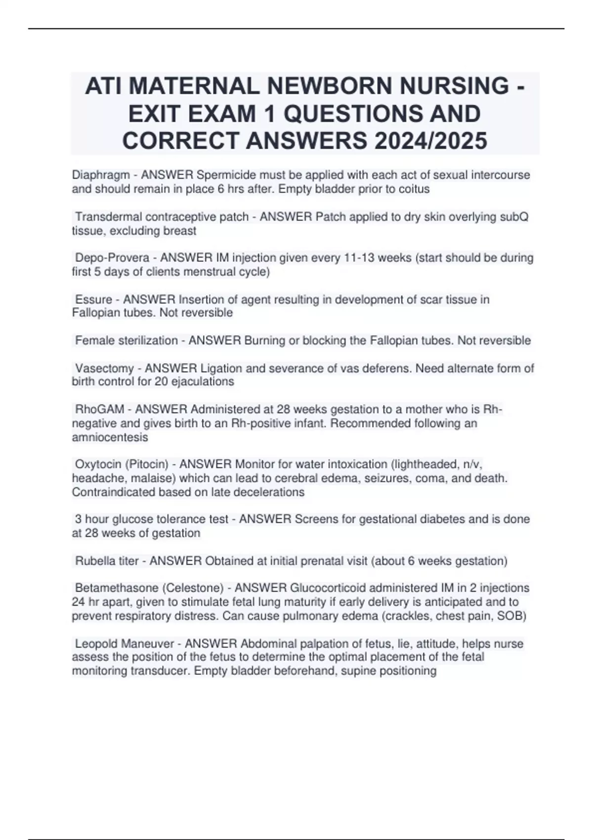 Diaphragm - ANSWER Spermicide must be applied with each act of sexual intercourse and should remain in place 6 hrs after. Empty bladder prior to coitus Transdermal contraceptive patch - ANSWER Patch applied to dry skin overlying subQ tissue, excluding breast Depo-Provera - ANSWER IM injection given every 11-13 weeks (start should be during first 5 days of clients menstrual cycle) Essure - ANSWER Insertion of agent resulting in development of scar tissue in Fallopian tubes. Not reversible Female sterilization - ANSWER Burning or blocking the Fallopian tubes. Not reversible Vasectomy - ANSWER Ligation and severance of vas deferens. Need alternate form of birth control for 20 ejaculations RhoGAM - ANSWER Administered at 28 weeks gestation to a mother who is Rhnegative and gives birth to an Rh-positive infant. Recommended following an amniocentesis Oxytocin (Pitocin) - ANSWER Monitor for water intoxication (lightheaded, n/v, headache, malaise) which can lead to cerebral edema, seizures, coma, and death. Contraindicated based on late decelerations 3 hour glucose tolerance test - ANSWER Screens for gestational diabetes and is done at 28 weeks of gestation Rubella titer - ANSWER Obtained at initial prenatal visit (about 6 weeks gestation) Betamethasone (Celestone) - ANSWER Glucocorticoid administered IM in 2 injections 24 hr apart, given to stimulate fetal lung maturity if early delivery is anticipated and to prevent respiratory distress. Can cause pulmonary edema (crackles, chest pain, SOB) Leopold Maneuver - ANSWER Abdominal palpation of fetus, lie, attitude, helps nurse assess the position of the fetus to determine the optimal placement of the fetal monitoring transducer. Empty bladder beforehand, supine positioning Steps of Leopold Maneuver - ANSWER Palpate client's fundus, determine location of fetal back, palpate fetal part presenting at the inlet, and palpate the cephalic prominence to identify the attitude of the head Ferning test - ANSWER If positive, indicates rupture of membranes Expected newborn temp - ANSWER 36.5-37.2 Expected newborn HR - ANSWER 120-160 Expected newborn RR - ANSWER 30-60 Expected newborn BP - ANSWER 60-80 S, 40-50 D Expected newborn length - ANSWER 45-55 cm Expected newborn weight - ANSWER 2,500-4,000 g What is effleurage? - ANSWER Client strokes abdomen using circular motion during contractions Maternal Serum Alpha-Fetoprotein - ANSWER Screening tool for neural tube defects that is effective between 15 and 22 weeks. levels above indicate the need for an ultrasound Position for transvaginal ultrasound - ANSWER Lithotomy position Biophysical profile assesses? - ANSWER Fetal HR, breathing, body movements, fetal tone, and qualitative amniotic fluid volume What does biophysical profile indicate? - ANSWER The risk of asphyxia Nonstress test - ANSWER Client presses a button whenever they feel fetal movement which allows nurse to assess FHR in relationship to the fetal movement