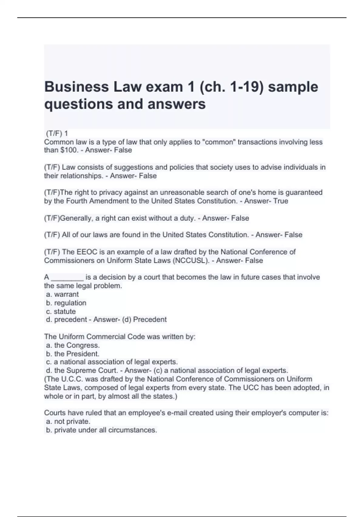 Business Law exam 1 (ch. 1-19) sample questions and answers