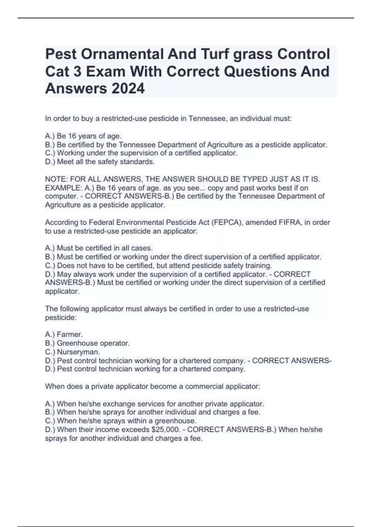 Pest Ornamental And Turf grass Control Cat 3 Exam With Correct Questions And Answers 2024