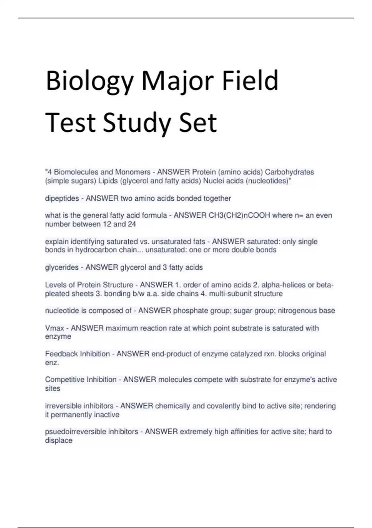 "4 Biomolecules and Monomers - ANSWER Protein (amino acids) Carbohydrates (simple sugars) Lipids (glycerol and fatty acids) Nuclei acids (nucleotides)" dipeptides - ANSWER two amino acids bonded together what is the general fatty acid formula - ANSWER CH3(CH2)nCOOH where n= an even number between 12 and 24 explain identifying saturated vs. unsaturated fats - ANSWER saturated: only single bonds in hydrocarbon chain... unsaturated: one or more double bonds glycerides - ANSWER glycerol and 3 fatty acids Levels of Protein Structure - ANSWER 1. order of amino acids 2. alpha-helices or betapleated sheets 3. bonding b/w a.a. side chains 4. multi-subunit structure nucleotide is composed of - ANSWER phosphate group; sugar group; nitrogenous base Vmax - ANSWER maximum reaction rate at which point substrate is saturated with enzyme Feedback Inhibition - ANSWER end-product of enzyme catalyzed rxn. blocks original enz. Competitive Inhibition - ANSWER molecules compete with substrate for enzyme's active sites irreversible inhibitors - ANSWER chemically and covalently bind to active site; rendering it permanently inactive psuedoirreversible inhibitors - ANSWER extremely high affinities for active site; hard to displace noncompetitive inhibitors - ANSWER do not compete for active site but act elsewhere on enz.; altering 3D shape photosynthesis - ANSWER anabolic process that converts sunlight into energy stored in the phosphate bonds of ATP, then more permanently stored in bonds of organic carbon compounds electron transport chain - ANSWER series of carrier molecules on the inner mitochondrial membrane which pass electrons through enzymes that pump protons to one side of the membrane, creating a proton gradient chemiosmosis - ANSWER the use of a gradient, such as a proton gradient, to generate energy. The ATP synthase enzyme uses the kinetic movement of protons down the gradient to store energy by converting ADP to ATP ATP - ANSWER Adenosine tri phosphate, a modified nucleotide that stores energy in it's phosphate bonds. fermentation - ANSWER glycolysis and the additional steps leading to the formation of ethanol or lactic acid, to make ATP. It does not include the Kreb's cycle (producing CO2) or the ETC. occluding/tight junctions - ANSWER nothing can diffuse between cells or past junction anchoring junctions - ANSWER physical joining so cells do not shear away communicating junctions - ANSWER gap junctions are formed by proteins called connexins that allow for undisrupted and very fast signal transmission plasmodesmata - ANSWER plant cells' equivalent of gap junctions G-actin - ANSWER globular monomer F-actin - ANSWER long filament