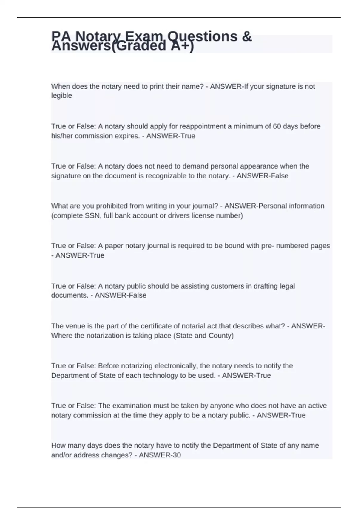 When does the notary need to print their name? - ANSWER-If your signature is not legible True or False: A notary should apply for reappointment a minimum of 60 days before his/her commission expires. - ANSWER-True True or False: A notary does not need to demand personal appearance when the signature on the document is recognizable to the notary. - ANSWER-False What are you prohibited from writing in your journal? - ANSWER-Personal information (complete SSN, full bank account or drivers license number) True or False: A paper notary journal is required to be bound with pre- numbered pages - ANSWER-True True or False: A notary public should be assisting customers in drafting legal documents. - ANSWER-False The venue is the part of the certificate of notarial act that describes what? - ANSWER-Where the notarization is taking place (State and County) True or False: Before notarizing electronically, the notary needs to notify the Department of State of each technology to be used. - ANSWER-True True or False: The examination must be taken by anyone who does not have an active notary commission at the time they apply to be a notary public. -