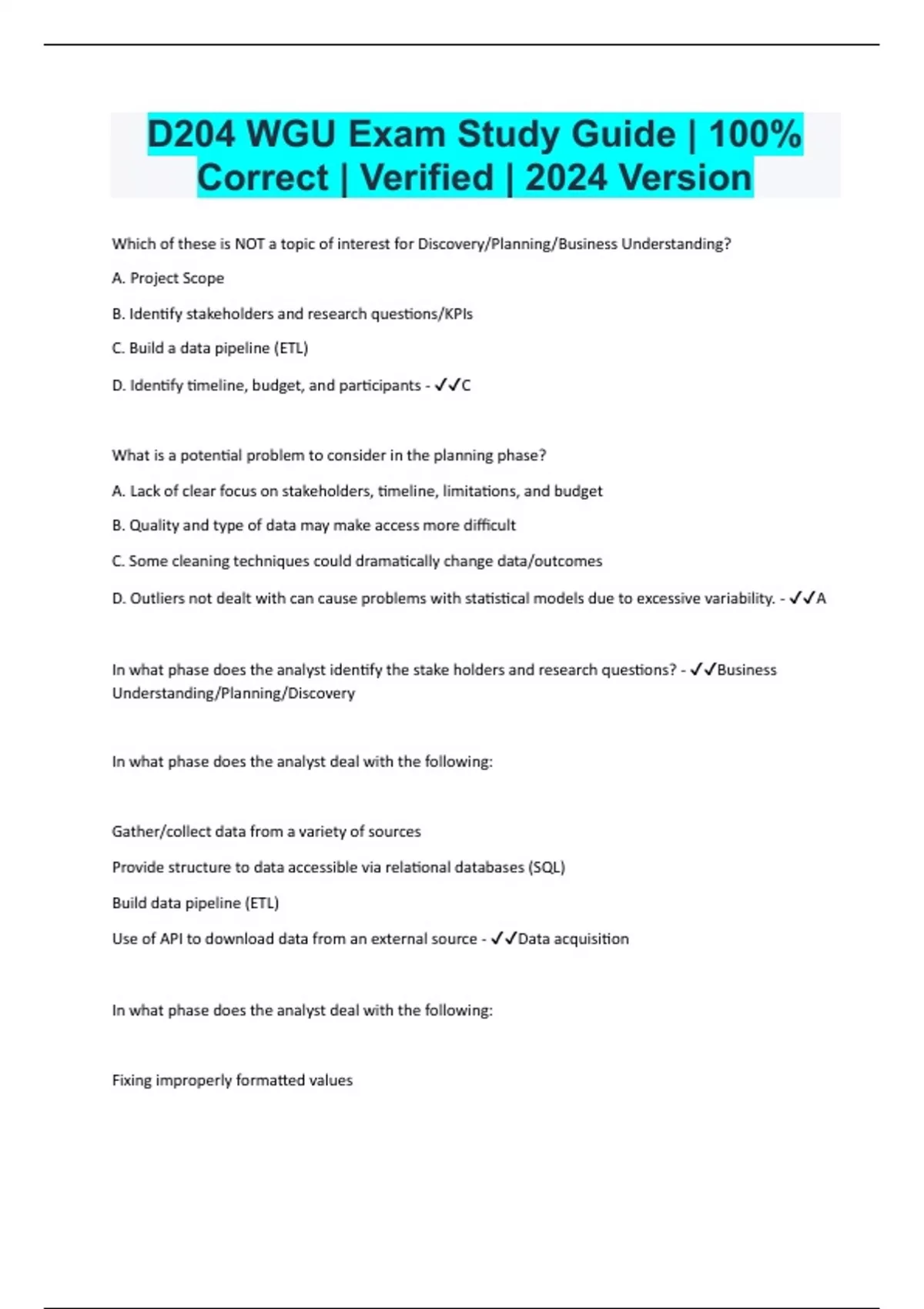 Which of these is NOT a topic of interest for Discovery/Planning/Business Understanding? A. Project Scope B. Identify stakeholders and research questions/KPIs C. Build a data pipeline (ETL) D. Identify timeline, budget, and participants - C What is a potential problem to consider in the planning phase? A. Lack of clear focus on stakeholders, timeline, limitations, and budget B. Quality and type of data may make access more difficult C. Some cleaning techniques could dramatically change data/outcomes D. Outliers not dealt with can cause problems with statistical models due to excessive variability. - A In what phase does the analyst identify the stake holders and research questions? - Business Understanding/Planning/Discovery In what phase does the analyst deal with the following: Gather/collect data from a variety of sources Provide structure to data accessible via relational databases (SQL) Build data pipeline (ETL) Use of API to download data from an external source - Data acquisition In what phase does the analyst deal with the following: Fixing improperly formatted values