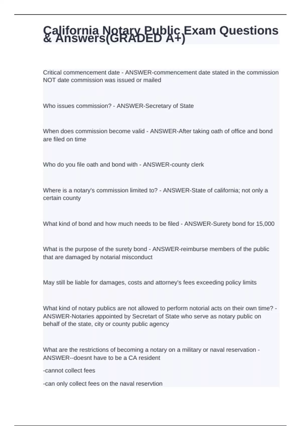 Critical commencement date - ANSWER-commencement date stated in the commission NOT date commission was issued or mailed Who issues commission? - ANSWER-Secretary of State When does commission become valid - ANSWER-After taking oath of office and bond are filed on time Who do you file oath and bond with - ANSWER-county clerk Where is a notary's commission limited to? - ANSWER-State of california; not only a certain county What kind of bond and how much needs to be filed - ANSWER-Surety bond for 15,000 What is the purpose of the surety bond - ANSWER-reimburse members of the public that are damaged by notarial misconduct May still be liable for damages, costs and attorney's fees exceeding policy limits What kind of notary publics are not allowed to perform notorial acts on their own time? - ANSWER-Notaries appointed by Secretart of State who serve as notary public on behalf of the state, city or county public agency What are the restrictions of becoming a notary on a military or naval reservation - ANSWER--doesnt have to be a CA resident -cannot collect fees -can only collect fees on the naval reservtion With who should the oath and bond be filed - ANSWER-county clerk in the county where the notary holds her principal place of business